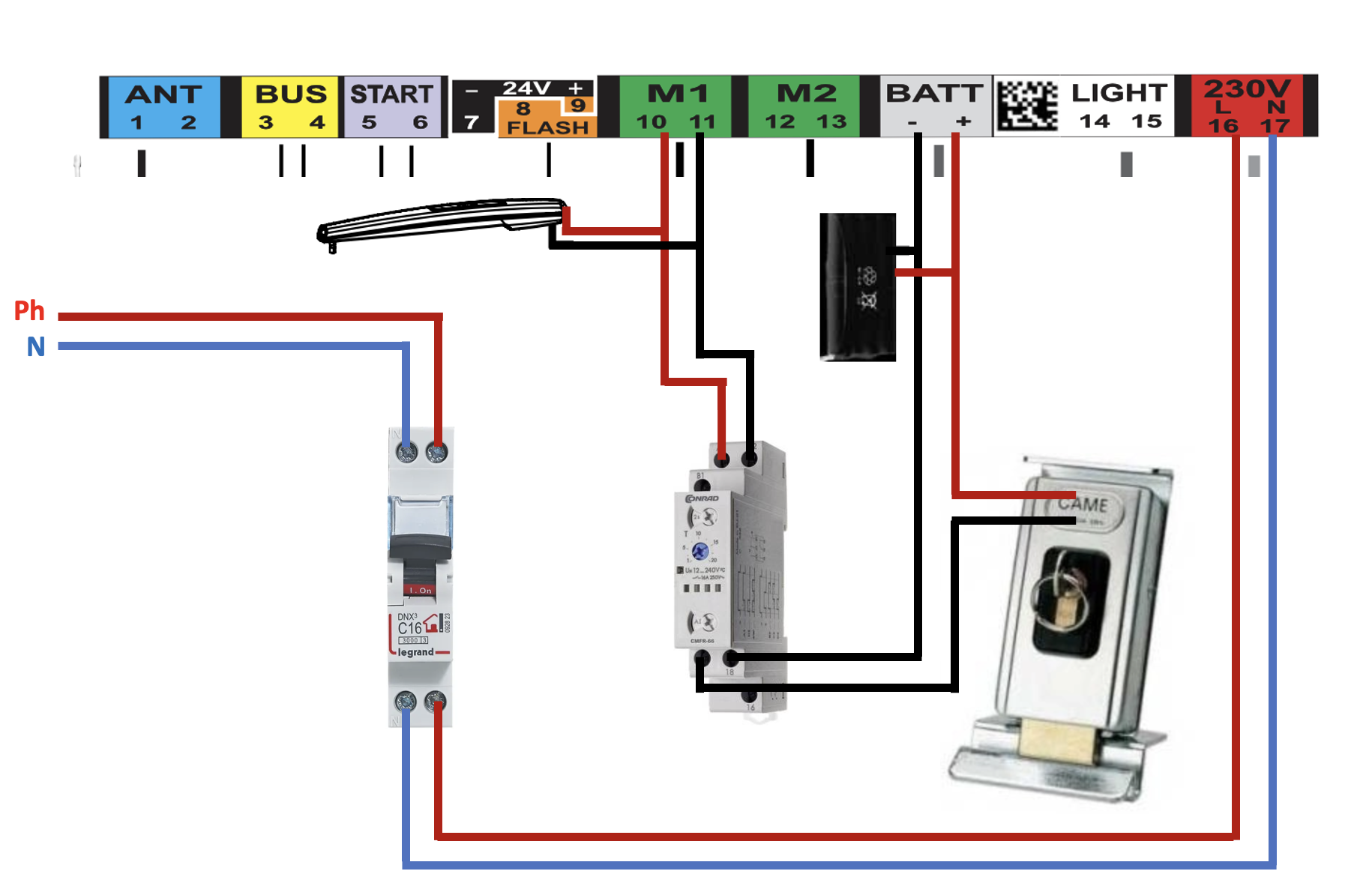Lorsque M1 est alimenté à la mise en route (avec une action sur votre télécommande), il alimente le relais temporisé qui ferme le circuit 12V de la serrure électrique pendant 2 secondes (en fonction de votre paramétrage). Le cycle reprend à la prochaine alimentation du moteur.