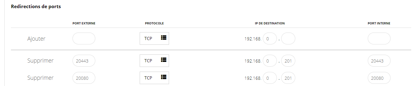 Pourriez-vous vérifier que vous avez bien effectuer l'ouverture du port 20443 dans l'interface de votre box ADSL car d'après le site internet ci-dessous, en entrant l'adresse IP publique de votre système et en mettant le port 20443 il semblerait que celui-ci ne soit pas ouvert :