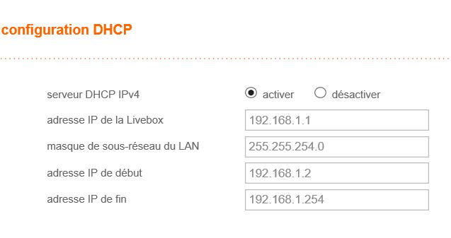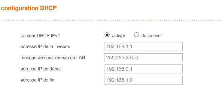 Si l'adresse IP de votre Box est 192.168.1.1, le DHCP soit être en début à minima 192.168.1.2 et fin à 192.168.1.254