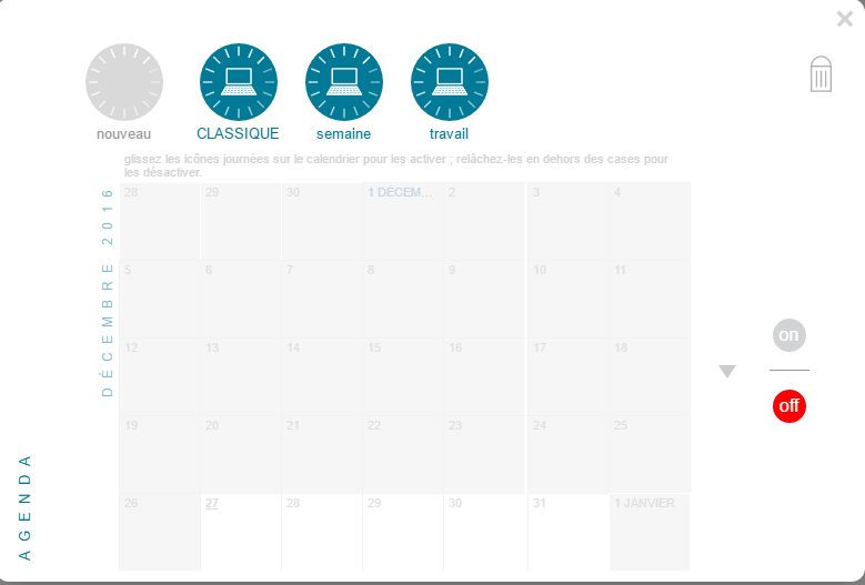 En effet, afin de pourvoir glisser votre journée dans l'agenda il est nécessaire que celui-ci soit en "ON". D'après vos screenshots, votre agenda est positionné sur "OFF" ce qui vous empêchera d'effectuer la manipulation.