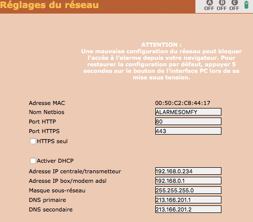 Après vérification avec notre serveur, le problème ne vient pas d'un mauvais réglage du système d'alarme mais d'un mauvais réglage de votre Box/modem ADSL. Il semblerait que les ports 80 et 443 ne soient pas ouvert pour l'adresse IP de votre système d'alarme.