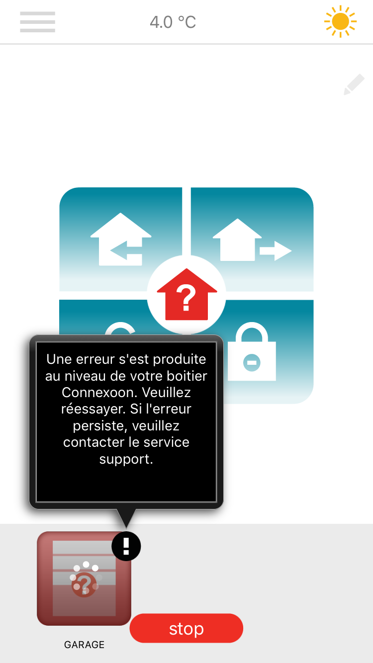 Tout fonctionne quand je souhaite ouvrir ou fermer la porte. En revanche j'ai un point d'exclamation sur la porte m'indicant : "une erreur s'est produite au niveau de votre boîtier Connexoon. Veillez réessayer. Si l'erreur persiste, veillez contacter le service support." (Voir pièce jointe)