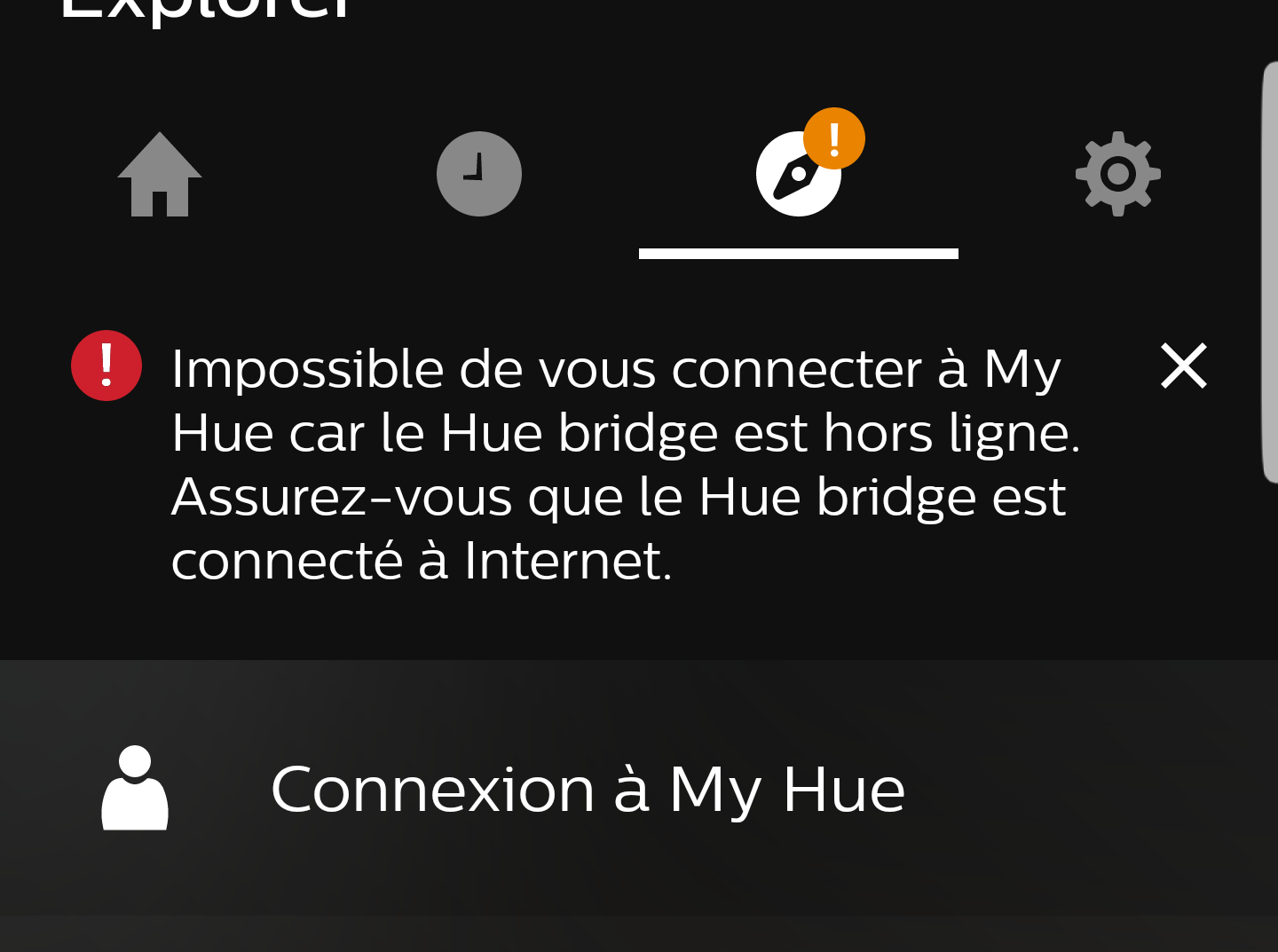 A chaque tentative de connection je me retrouve avec le même message : "Impossible de se connecter à My Hue car Hue bridge est hors ligne . Verifier que le hue bridge soit connecté à internet ."