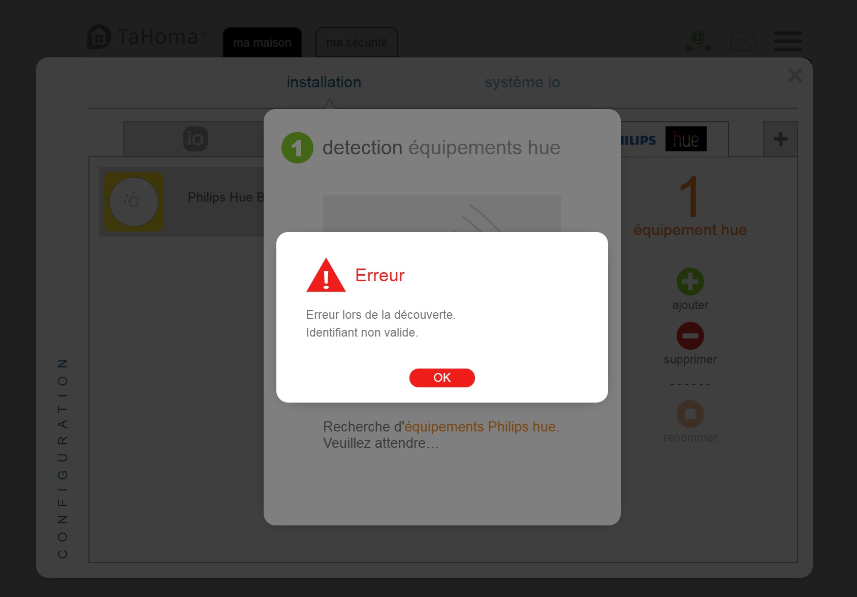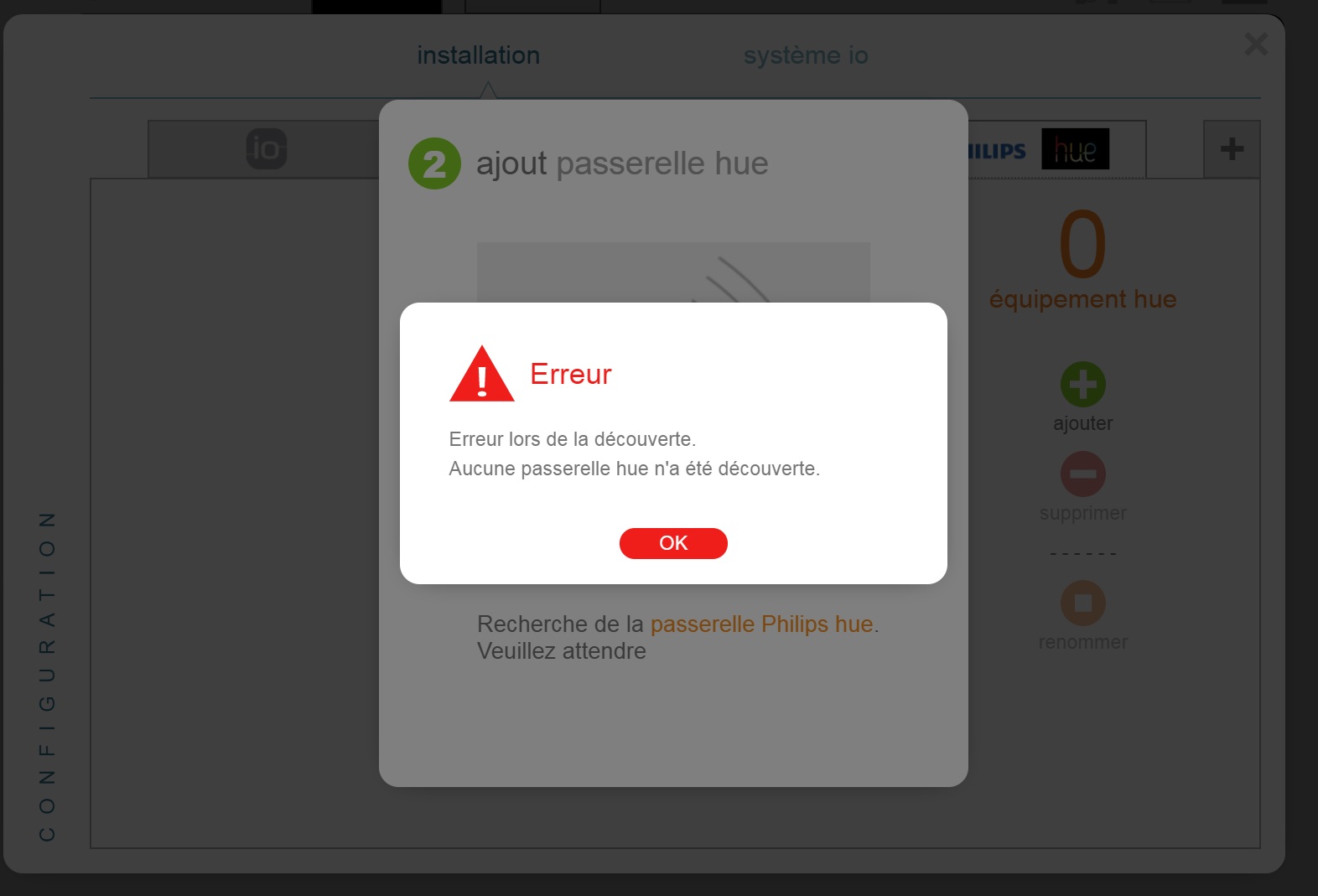 Vous (SOMFY) rencontrez de grosses difficultés d'appairage depuis la dernière mise a jour HUE Pourtant nous (les consommateurs) le découvrons APRES avoir acheté votre solution domotique TAHOMA BOX. Après avoir eu un équipement "fantôme" HUE dans mon interface, il existe ce jour encore l'onglet sans rien à l'intérieur et avec la même erreur systématique et réccurente que vous trouverez ici sur ce forum : "Erreur lors de la découverte. Aucune passerelle hue n'a été découverte"