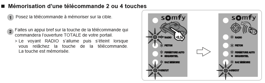 Justement j'ai bien procédé à cette manipulation, quand j'approche la télécommande à mémoriser vers la cible du boitier électronique, rien ne se passe. Aucun voyant du boitier ne s'allume quand j'appuie sur la touche 1 ou 2 de la télécommande.
