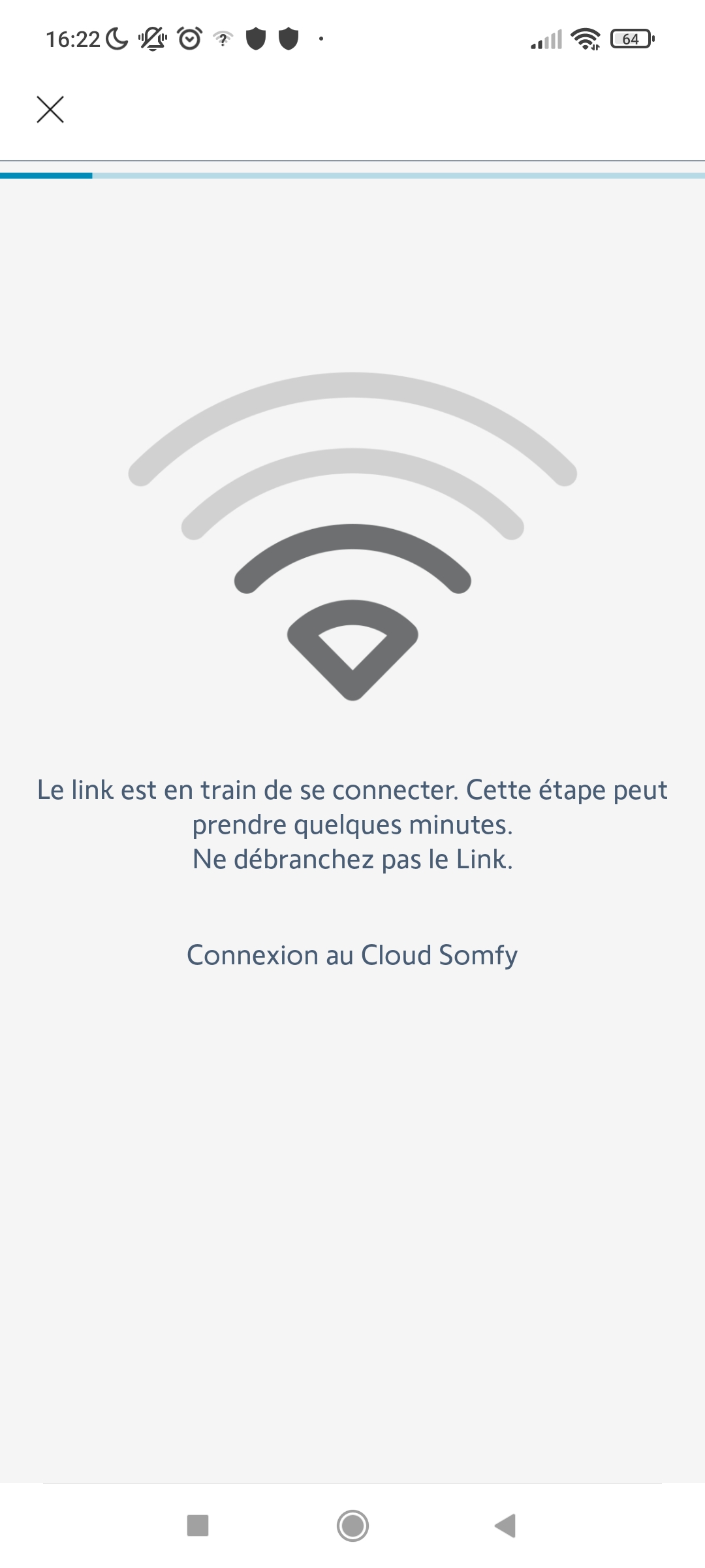 J'ai le meme probleme cela fait plusieurs heures que je tente de me connecter, mais je suis bloqué sur la connexion au cloud somfy !