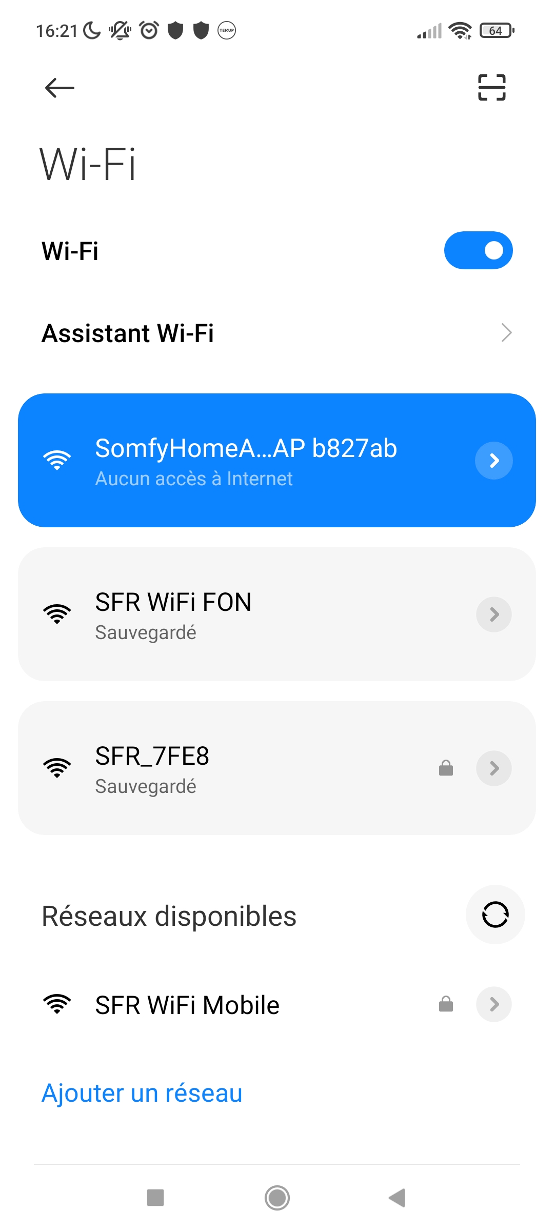 Une fois que vous devez sélectionner le réseau SomfyHomeAlarm/Myfox il faudrait garder la connexion après le message indiquant qu'il n'y a pas d'accès a internet.