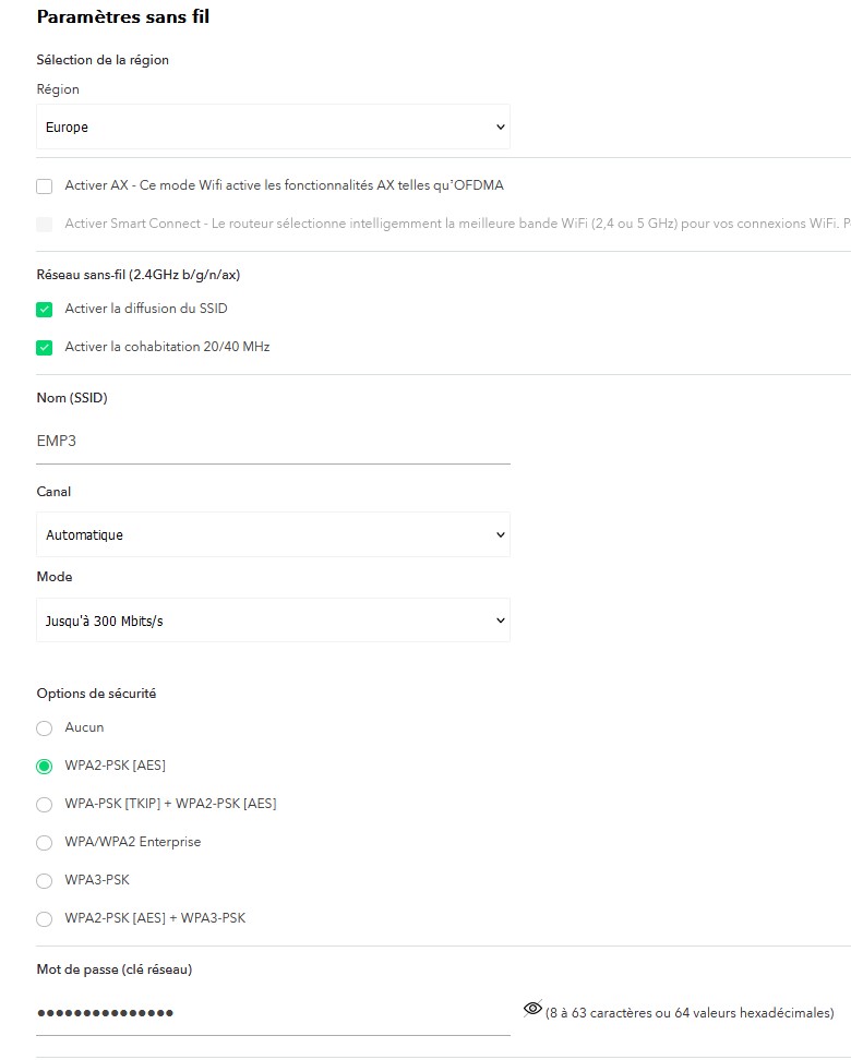 SSID et mot de passe conforme aux préconisations (moins de 45 lettres et pas de caractères spéciaux) seulement des minuscules