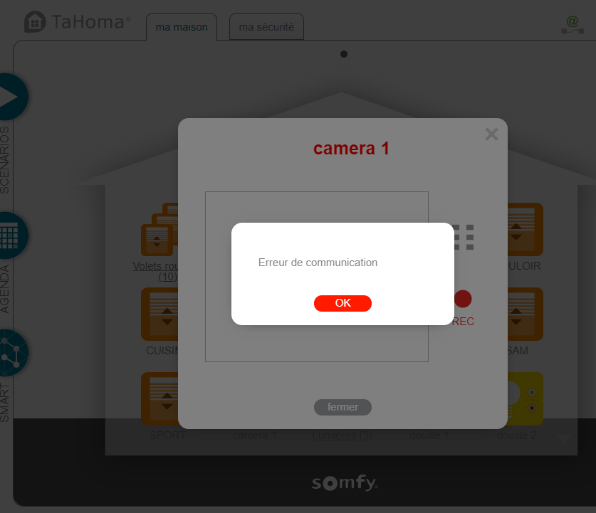 Sur la console Tahoma, l'icône de la caméra apparaît bien, mais lorsque je clique dessus, le message "erreur de communication" apparaît (cf photo en pièce jointe).