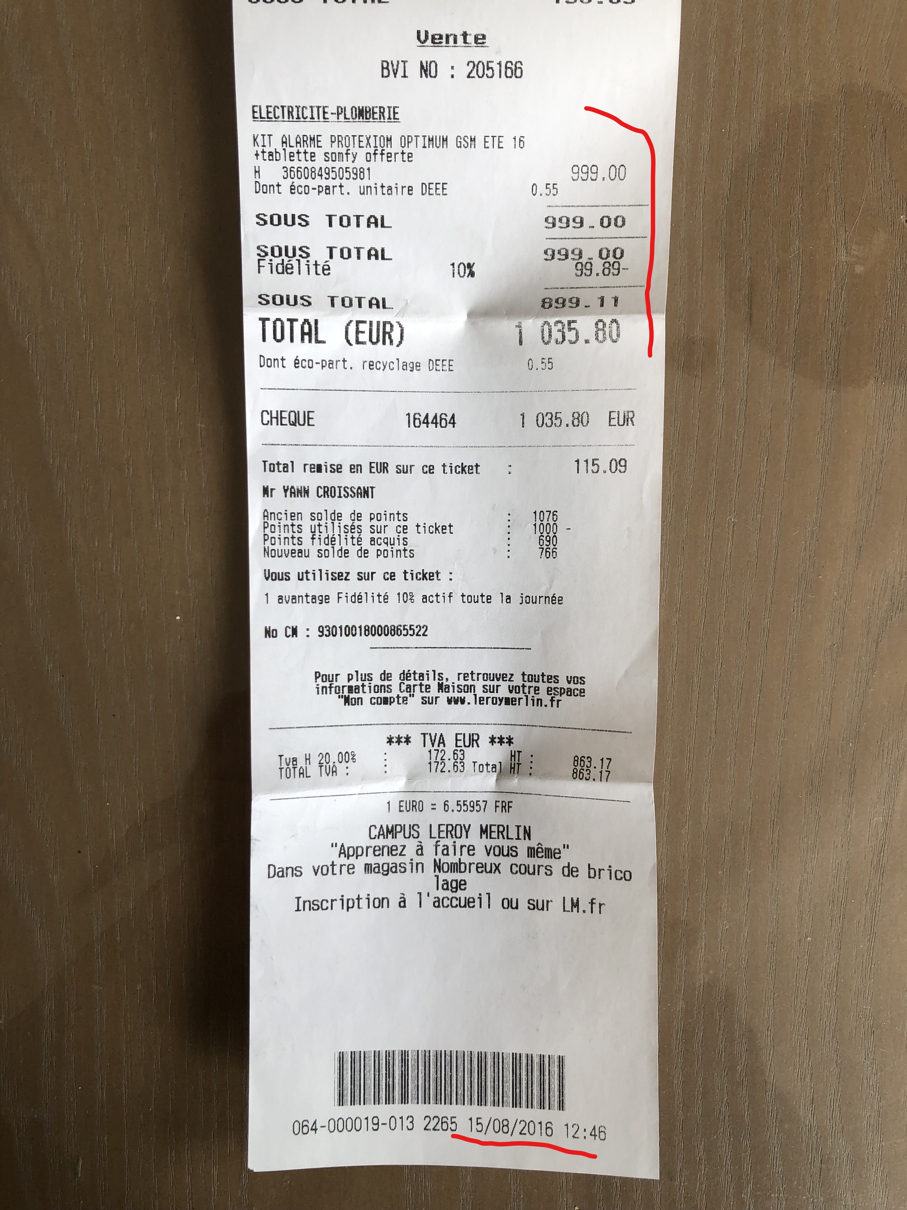 La date d'achat de la centrale est le 15/08/2016.