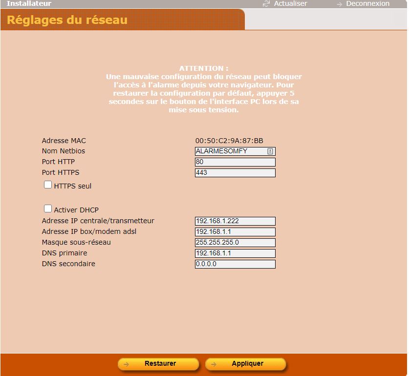 Afin d'identifier la source du défaut que vous rencontrez, pourriez-vous me transmettre une copie d'écran des menus "Réglages de du réseaux" et "Réglages de l'interface" de l'interface PC de votre système d'alarme en compte installateur ?
