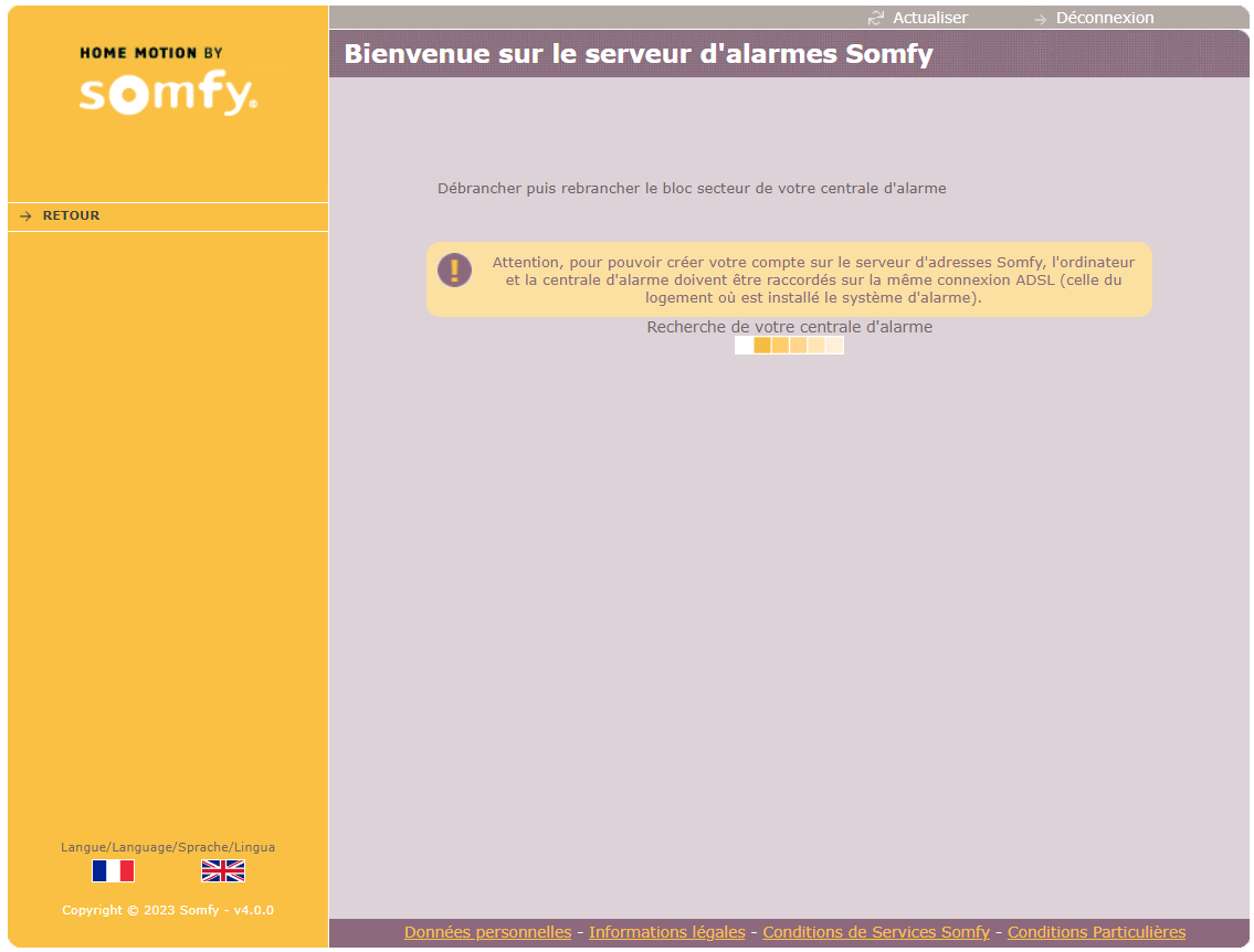 Aujourd’hui, impossible de reconnaître la centrale d’alarme sur alarmesomfy.net, la recherche n’aboutît jamais et tourne indéfiniment.