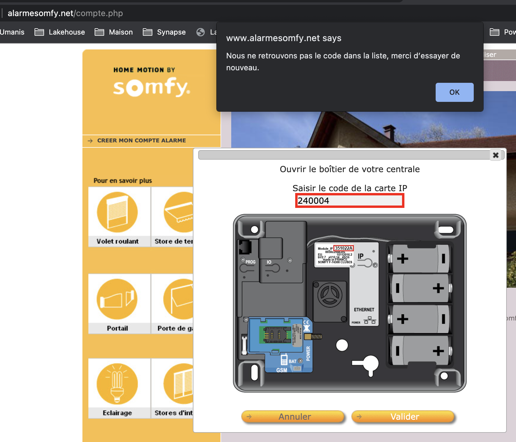 Je suis bloqué sur alarmesomfy.net car je ne sais pas quel code indiquer pour créer mon compte. Ceux trouvés dans ma centrale ne donnent rien.