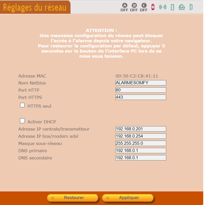 Tout fonctionne bien en local : j’ai bien accès à l’alarme en 198.168.1.75 (inchangé après de multiple reste de la livebox 5 : la livebox mémorise bien les anciennes IP allouées).