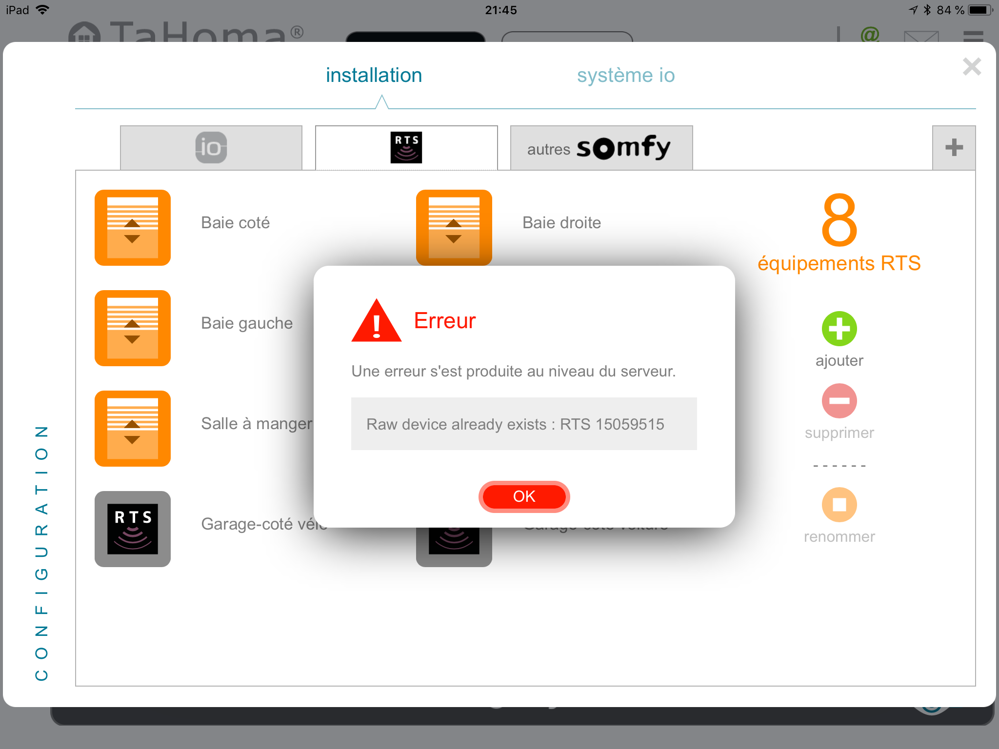 suite à la réinitialisation de mon portail, je n'arrive plus à réinstaller mon portail sur ma tahoma. j'ai bien ajouté la télécommande relais sur mon portail mais au moment d'ajouter mon portail avec la référence du bouton enregistré sur mon portail, j'ai un message d'erreur disant que le portail existe déjà alors que je l'ai supprimé. Pouvez vous m'aider ? Merci d'avance