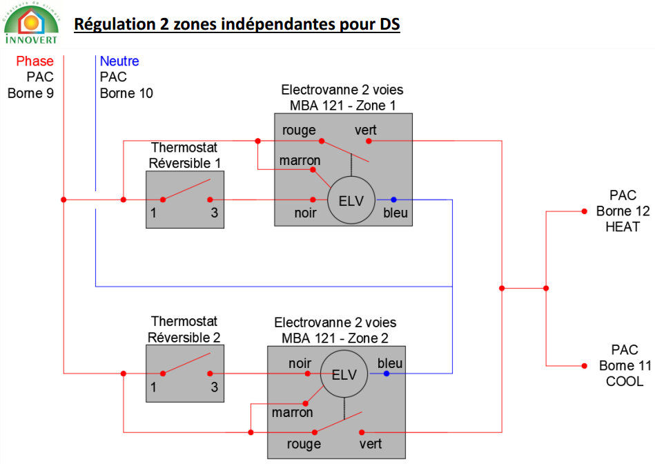 J'ai commandé une boxe Tahoma pour gérer mes volets roulants et ma porte de garage (Somfy en iO). Je vais avoir un système de chauffage de plafond rayonnant et raffraichissant via une pompe à chaleur Panasonic Aquarea Monobloc triple service (chauffage, rafraichissement, eau chaude sanitaire) référence : WH MDC07H3E5 + DGC200. Aujourd'hui le chauffagiste me propose dans son devis de gérer mon chauffage avec des thermostats de la marque DELTA DORE TYBOX. Comme rien n'est encore posé je préférerai avoir un seul montage global de la même marque SOMFY pour mes ouvertures ET mon chauffage. Je souhaiterai gérer mes 3 zones de chauffage avec ma Tahoma (facile d'utilisation et qui fonctionne à distance sur mon portable). Est ce que c'est possible et si oui de quoi ai-je besoin? Voici le schéma de montage que m'adresse le chauffagiste à la différence que j'aurai 3 zones et non 2 zones comme sur le schéma. Merci beaucoup pour votre aide. Mon électricien et mon chauffagiste ne savent pas me répondre...