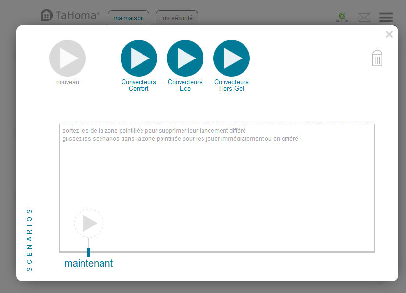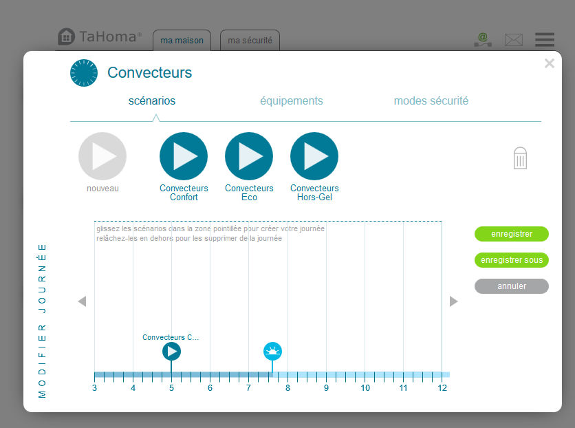 Il faut faire comme le dit Noël : faites débuter votre scénario confort dans l’agenda à 5h00 du matin et votre scénario eco a 22h00. Vous pouvez tout faire varier, radiateur par radiateur. Essayez par exemple de créer une journée essai. Sélectionnez un radiateur (pas un scénario) et faites le glisser sur une heure quelconque. Vous pourrez ensuite régler son mode sur confort. Plus tard dans la journée sélectionnez le même radiateur et passez le sur éco. Voilà. Vous voyez qu’il faut indiquer un début et une fin de cycle de chauffage. Vous pourrez ensuite faire la même chose avec les scénarios.