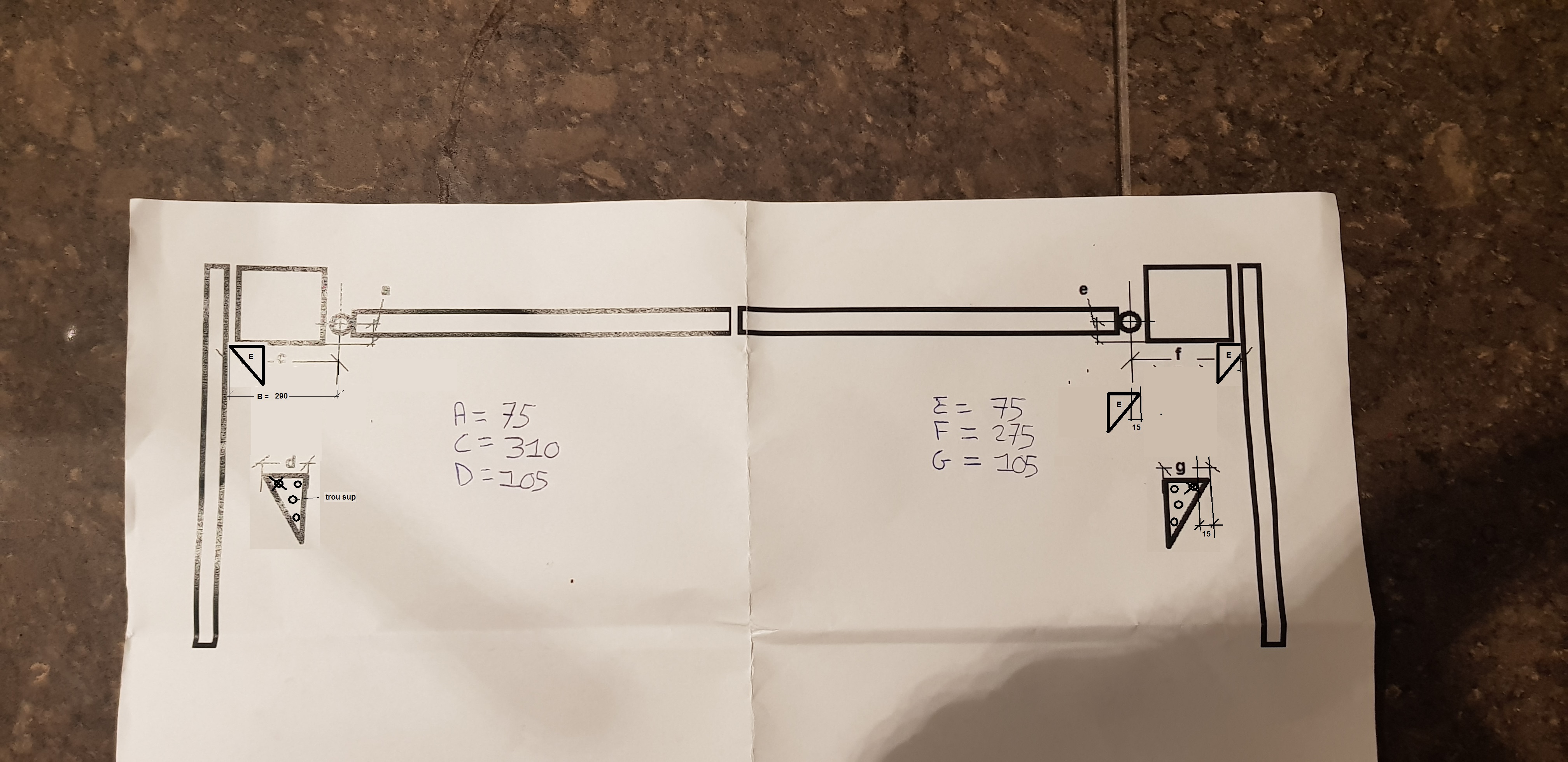 Déplacez l'équerre pour obtenir la cote de 290 et tourner la en E. Quitte à ce que l'équerre sorte en delà du pilier. vous faites un trou comme indiqué pour modifier et améliorer sa fixation.