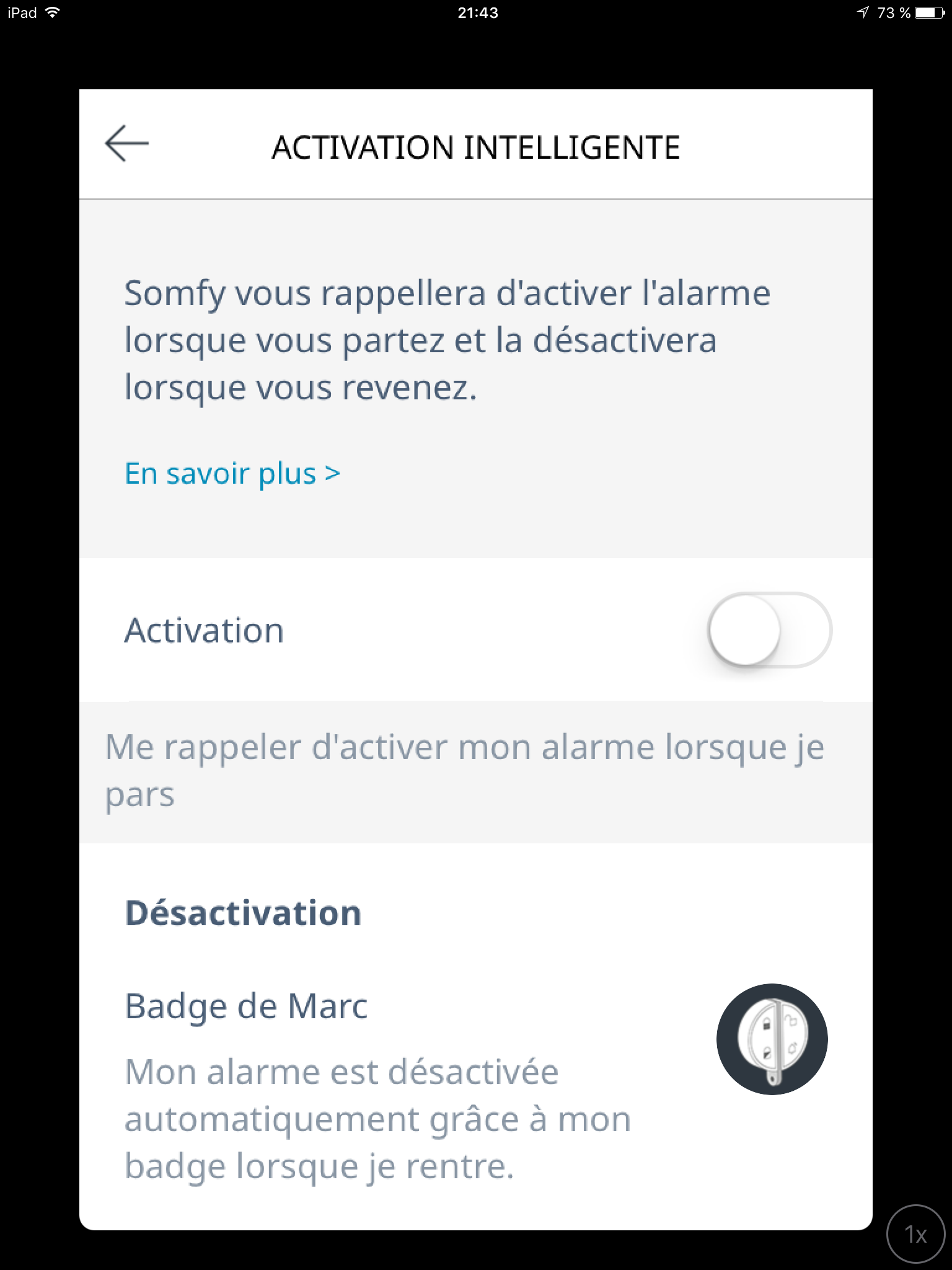 Bonsoir, concernant l'activation intelligente, j'ai rusé et je partage ma ruse. En effet avec l'application mobile la désactivation se fait toute seule en geolocalisation. Cependant cela ne fonctionne plus si on assigne aussi un badge au même compte.