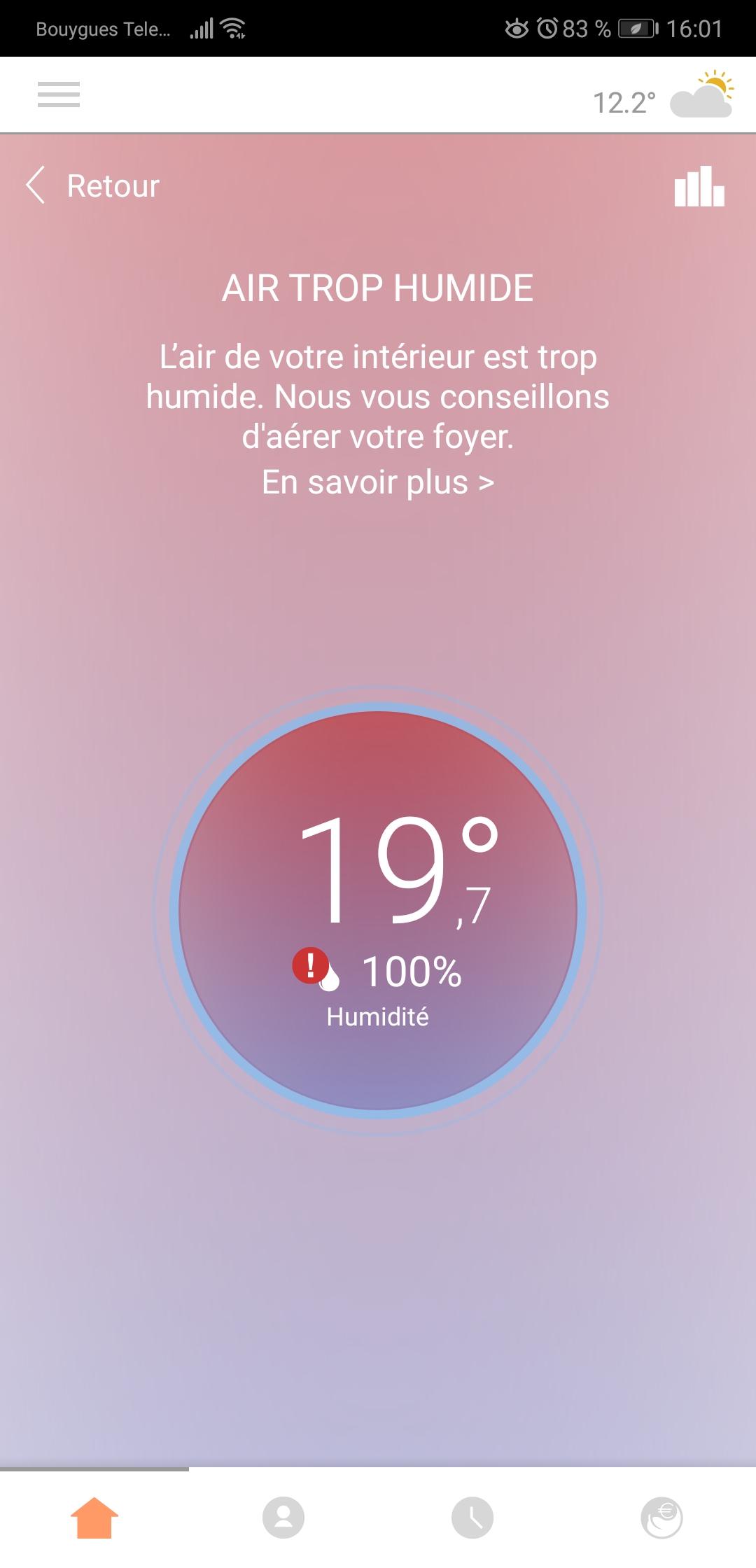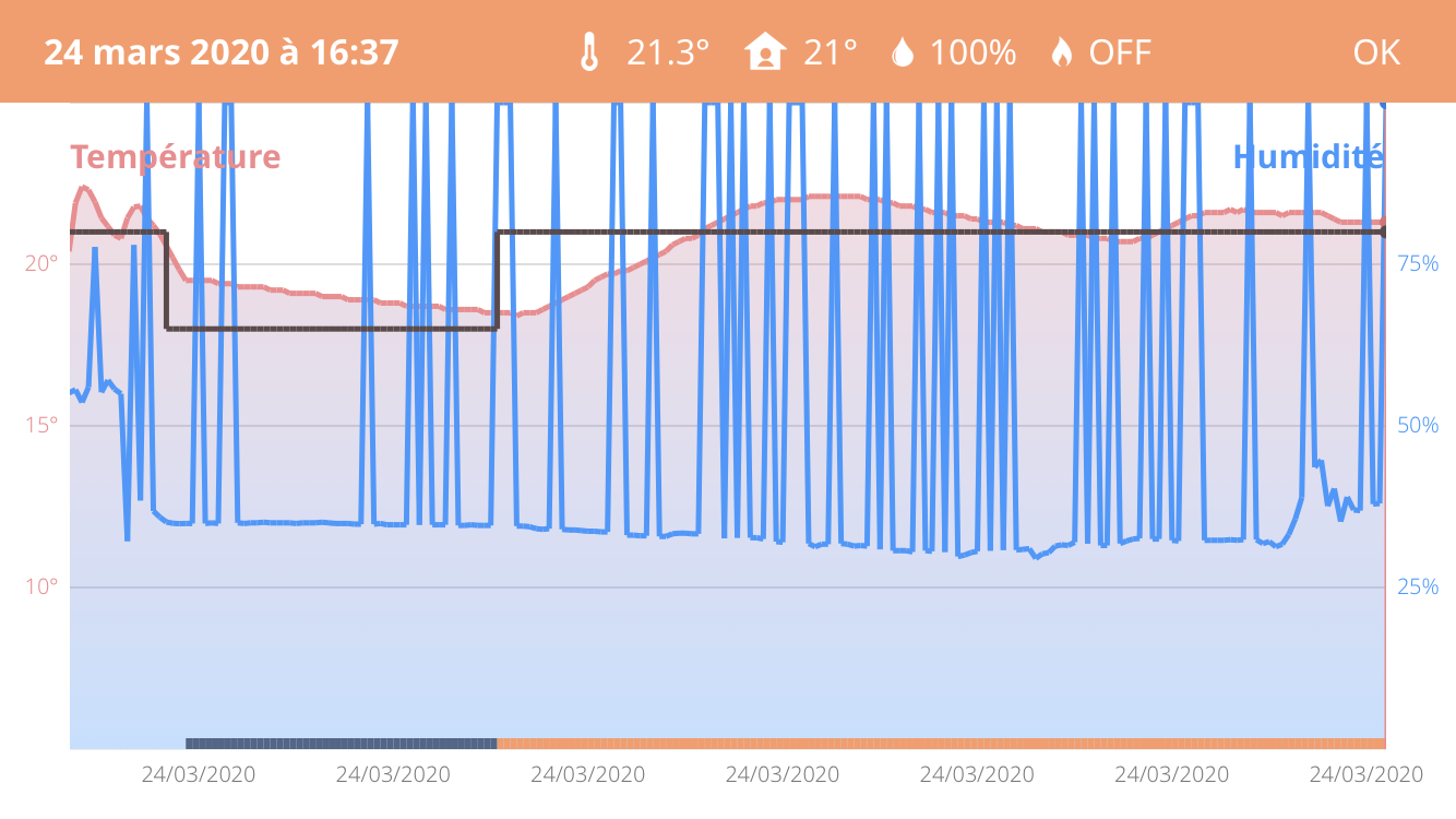 depuis quelques semaines j'ai le même souci; le taux d'humidité reste régulièrement bloqué à 100% (cf. captures).