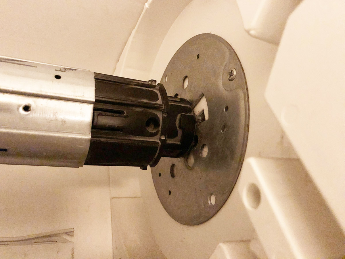 Ca y est : le vissage sauvage avait bien rentré un peu le métal dans l'embout en plastique. Un petit coup de perceuse pour que le trou soit propre, et c'est rentré. Le tambour est démonté.
