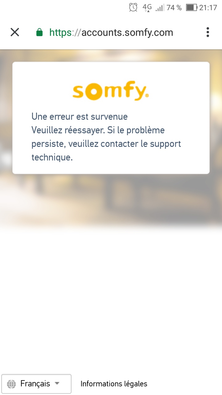 Sur mon téléphone Android, j'essaie désespérément d'associer mon compte Thermostat connecté Somfy et j'ai le message suivant : "une erreur est survenue. Veuillez réessayer. Si le problème persiste, veuillez contacter le support technique".(voir copie écran). J'ai désinstallé et réinstallé les applis Google Home et Thermostat Connecté, mais rien n'y fait. Pouvez-vous intervenir ou m'indiquer la marche à suivre ?
