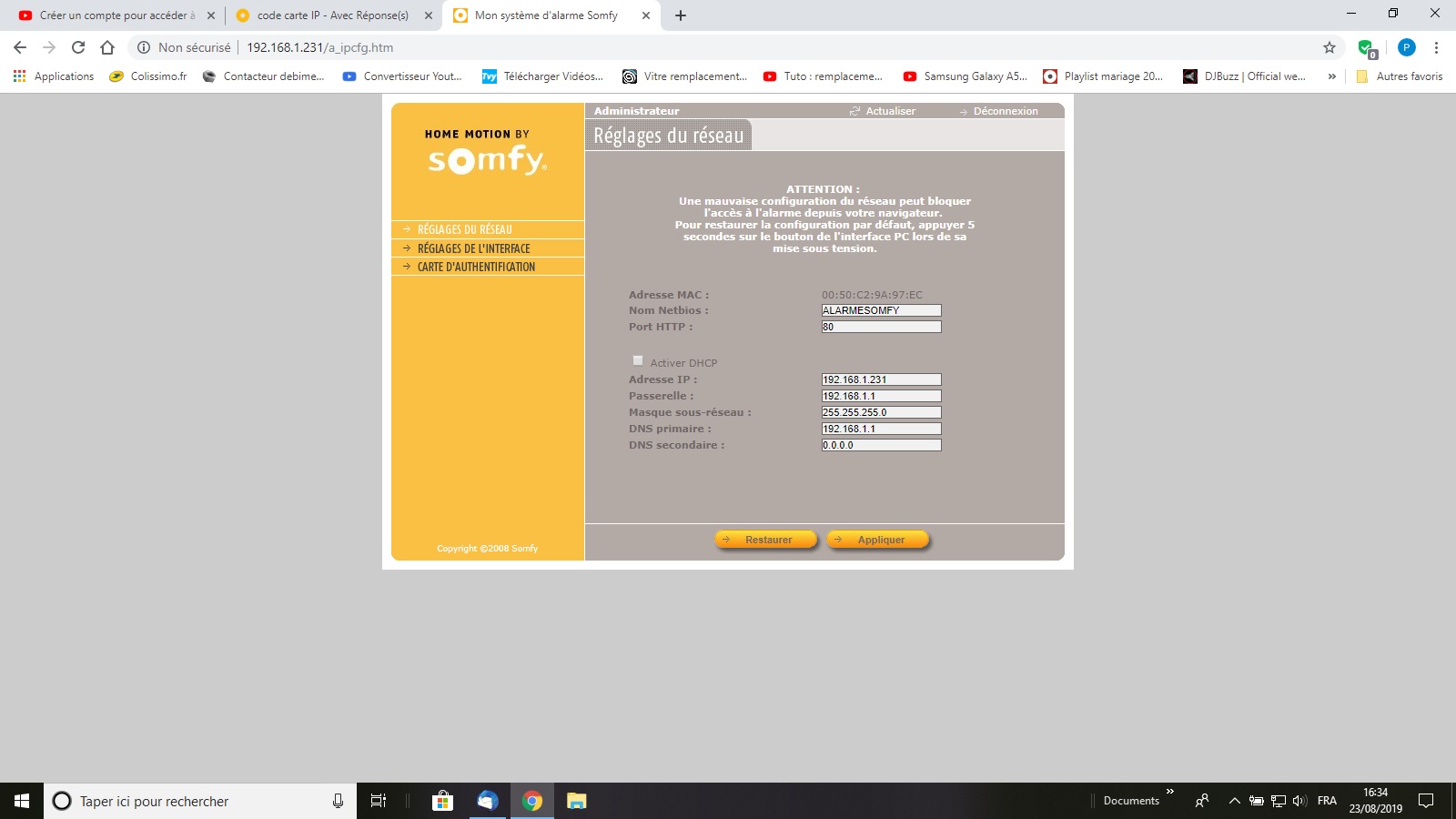 En tapant le code : 2480-03,(trouver sur le forum) la recherche se lance, je débranche puis rebranche la centrale mais aucune détection (ordinateur et alarme sur le même réseau bien sûr).