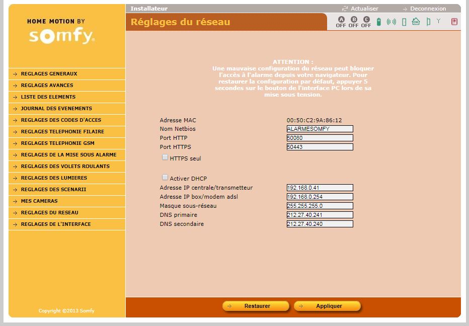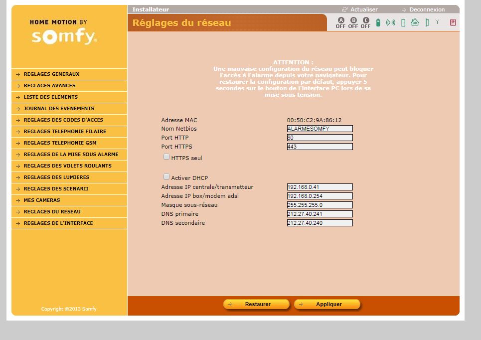 Comme indiqué par Guillaume, avez-vous modifié les ports sur le serveur ? http://www.alarmesomfy.net ?