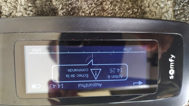 Les programmes enregistrés sur la Nina Timer (ouvertures / fermetures des BSO à des horaires programmés) ne s'exécutent pas, bien que le mode Horloge soit activé. Le message affiché est le suivant lorsque la télécommande est sur sa base : Echec de la commande.