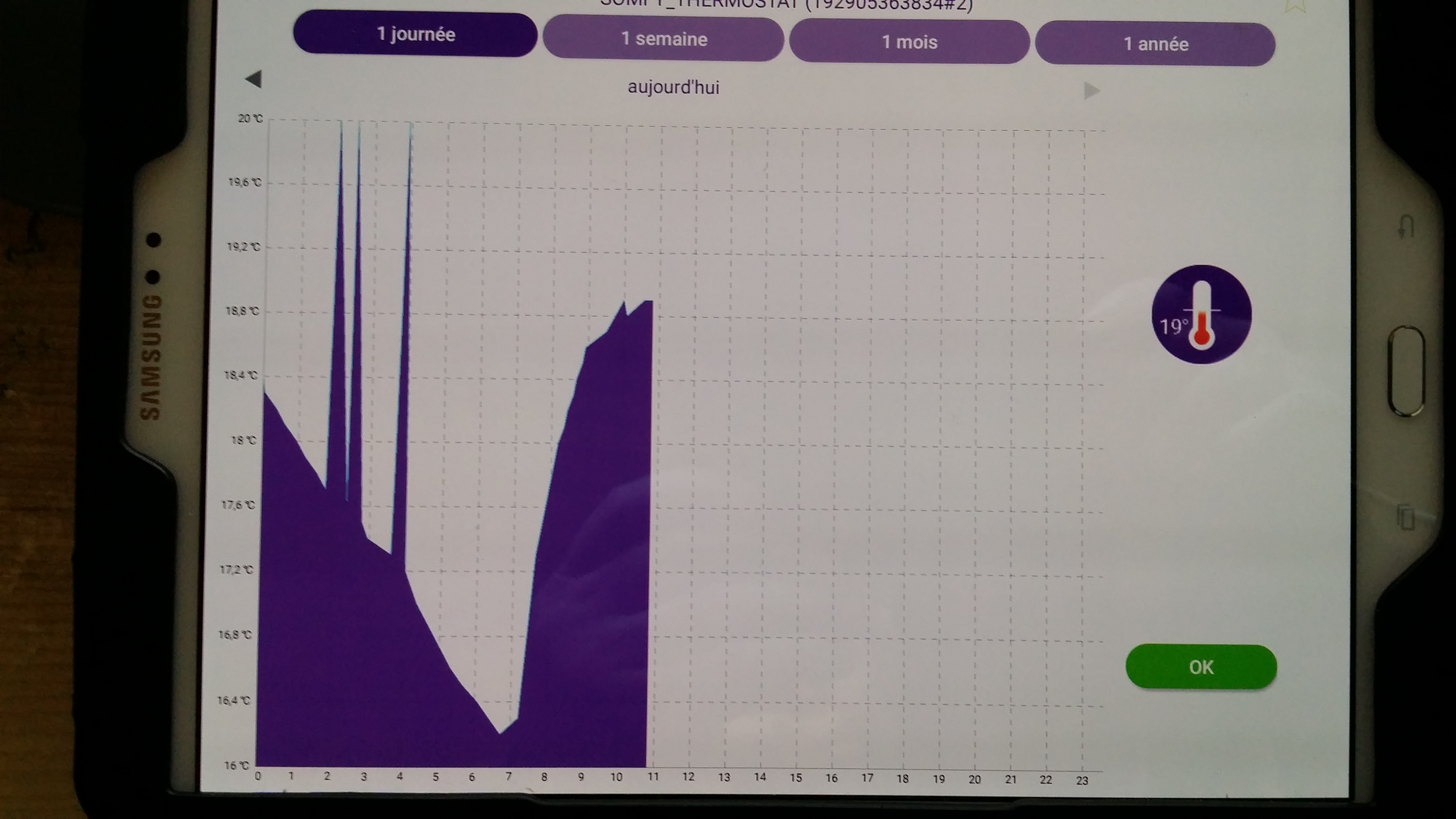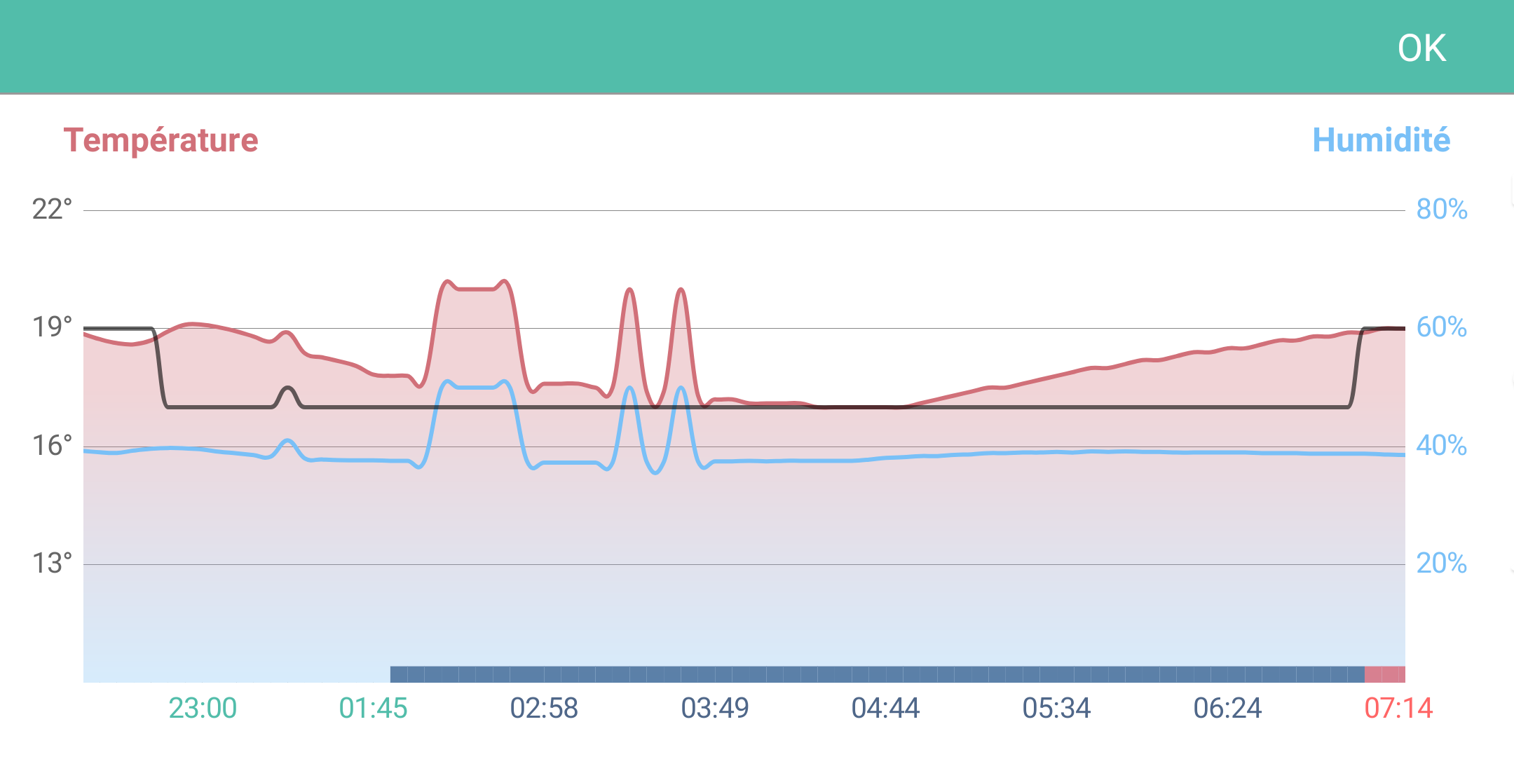 J utilise le dernier thermostat radio connecte Somfy depuis 2 mois environ en relève de température. Depuis le 30 mars entre 2h et 4 h du matin l enregistrement des courbes de température et humidité présente entre 1 et 4 pics importants et irréels tant sur le soft tahoma que sur celui du thermostat connecté. A titre d information la chaudière est programmée par ailleurs ,pour ne pas fonctionner la nuit