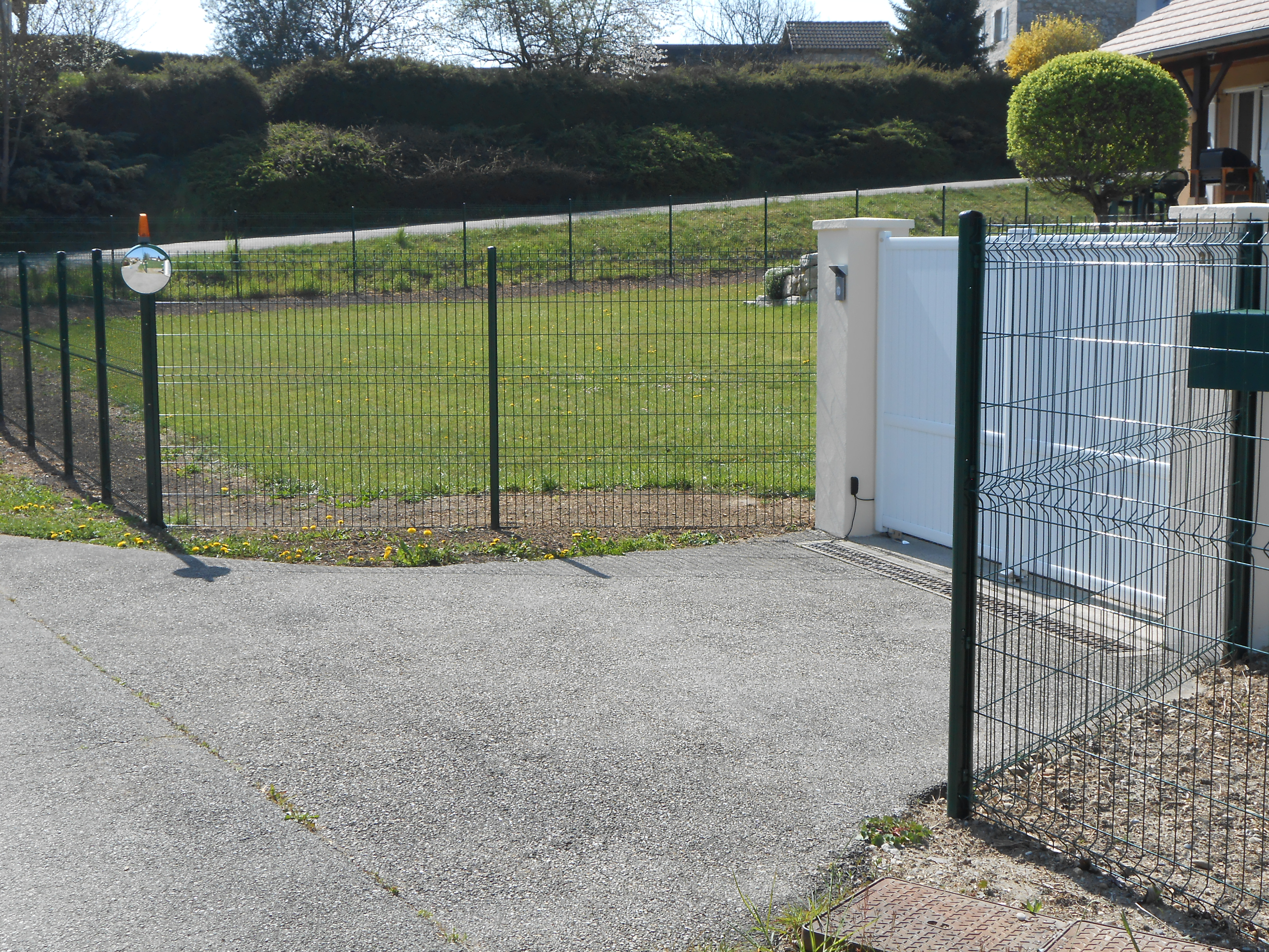 Depuis la suppression totale de la haie, le feu est fixé sur un poteau en angle de rue de la nouvelle clôture à 180 de haut ainsi que le miroir de rue.