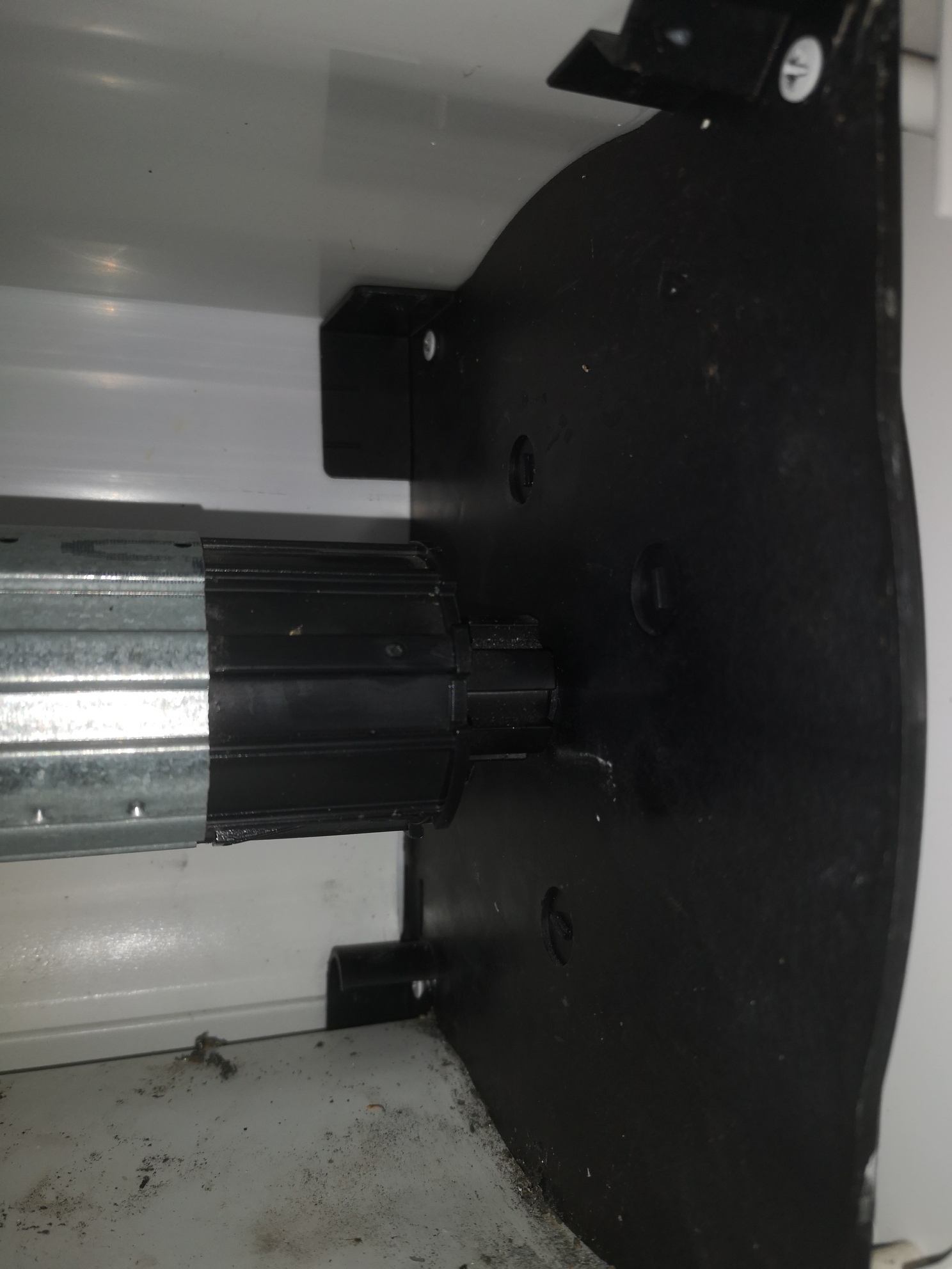 C'est clairement visible sur vos photos côté opposé au moteur : au niveau de l'embout plastique noir, il y a deux petites languettes (toujours noires) qui empêchent cet embout de rentrer dans l'axe galva. Il faut pincer ces deux languettes et, en même temps, repousser l’embout à l'intérieur du tube (prendre un outil pour faire bras de levier car c'est généralement dur... souvent lié aux bavures de tronçonnage restées sur l'axe galva). Cela vous donnera le débattement nécessaire pour déboîter l'axe qui sera ainsi plus court.