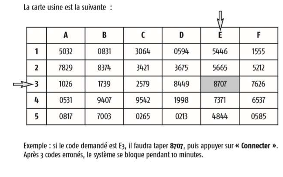 Si vous avez réinitialisé votre module IP, en effet, la carte de codes d'authentification (c'est comme cela que ça s'appelle) est revenue aux valeurs usine (voir photo).