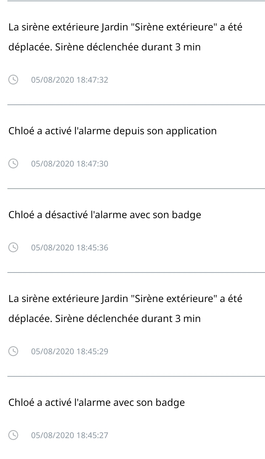 Quelques heures après, lors de l’activation de l’alarme pour la nuit (en mode nuit, lorsque j’ai appuyé sur le bouton du badge, l’alarme s’est mise en route immédiatement pour le motif suivant : « La sirène extérieure Jardin "Sirène extérieure" a été déplacée »
