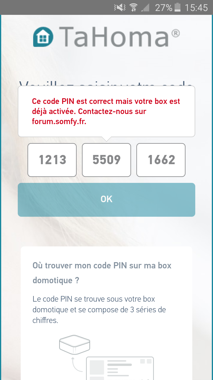 Comme de nombreuses personnes sur ce forum, j'ai un message d'erreur lors de l'activation de ma Box Tahoma : "Ce code PIN est correct mais votre box est déjà activée."