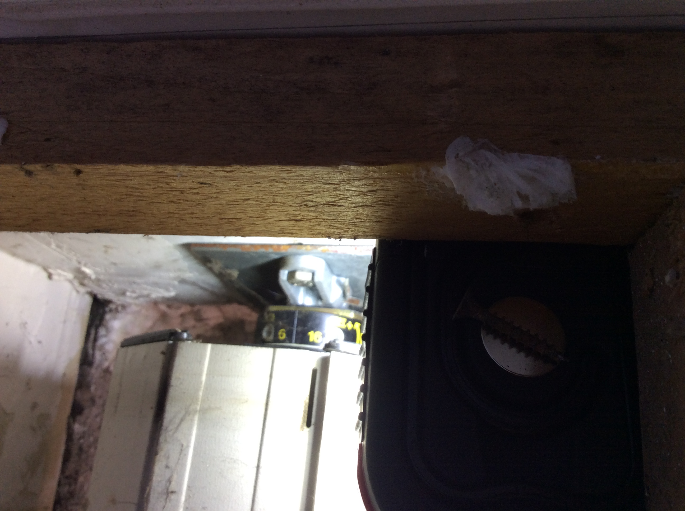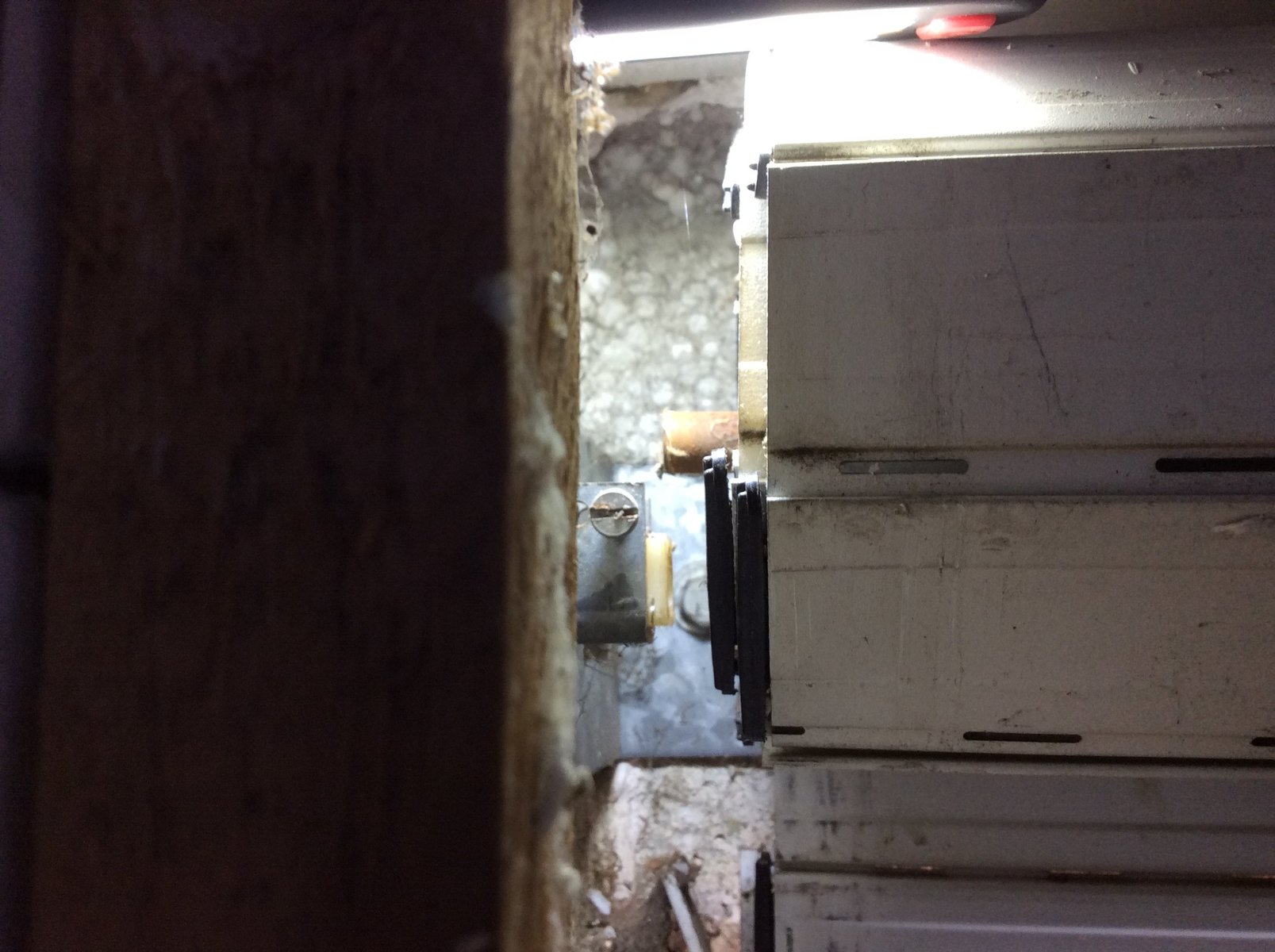 L'axe de support du moteur est sorti de son support, (à gauche sur la photo) et le tout (moteur + 3/4 du volet) repose donc sur le fond du coffrage . En fait seule le côté opposé au moteur (lequel est à droite sur la photo) est sorti de son support . Provisoirement j'ai ajouté quelques morceaux de bois pour maintenir l'ensemble à peu prêt horizontal (pour la photo)