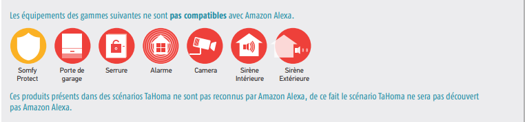 en verité j'ai une alarme somfy rts depuis de nombreuses années et voila que depuis peu je me suis equipé de tahoma et d'une camera indoor avec volet de fermeture (privée) que d'apres la notice on pouvais commander par alexa en ce qui concerne l'alarme maison je ne veux rien changer deplus pour commander la mise en route de ma camera je suis obligé de dire "alexa active l'alarme mais elle fonctionne que dans un sens (pas possible de la desactiver par la voix ) mais j'ai l'impression que tout ce systeme et moyen moyen j'ai deja mis un temps fou a pouvoir commander mes volets malgres une bonne installation mais je ne desespere pas de trouver pour ma camera en tout cas je vous remercie pour vos réponses cordialement