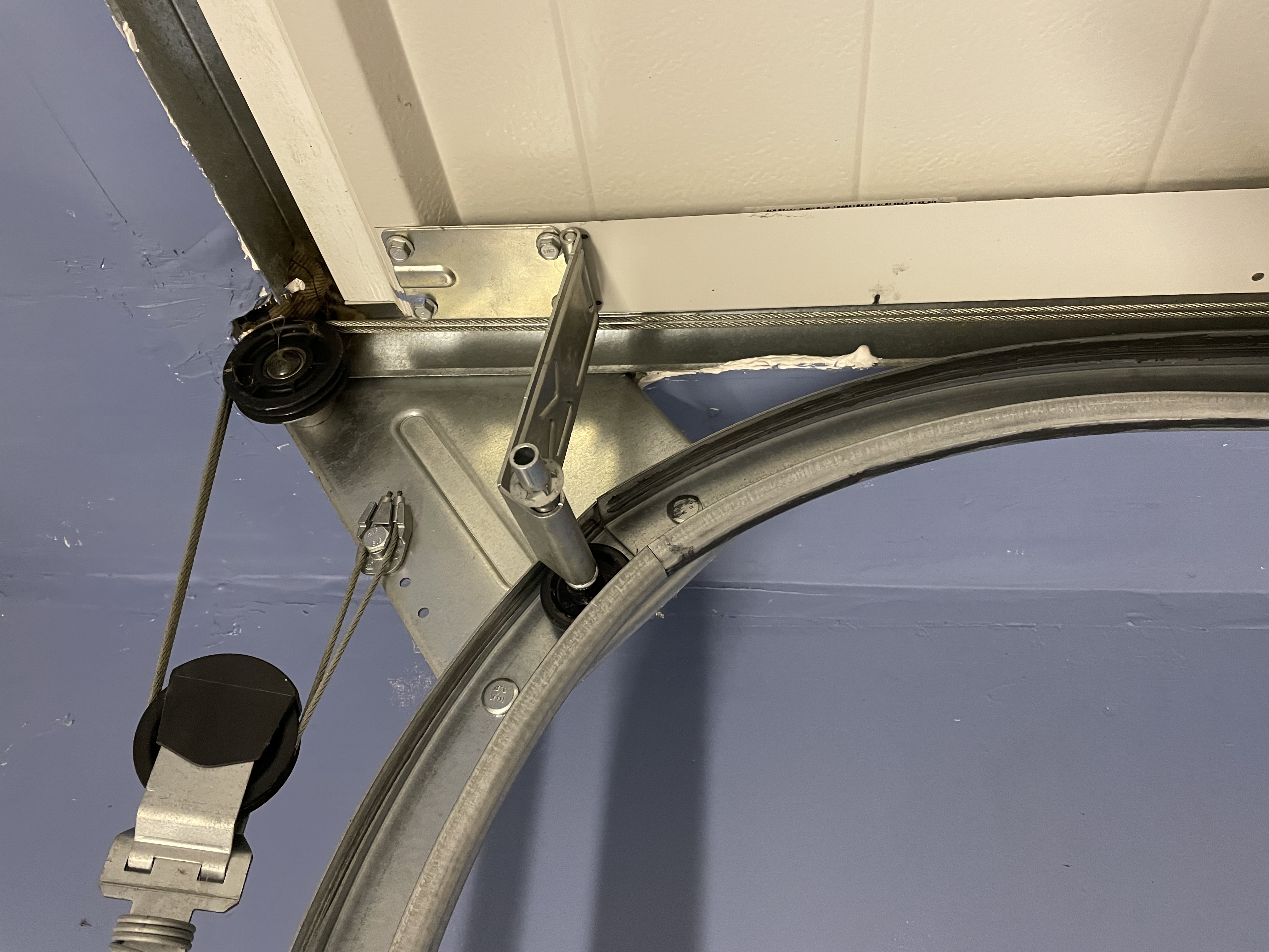 Après avoir raccourci le bras de liaison aussi, sans résultat, je le suis simplement rendu compte que la roulette de la dernière section de la porte avait être monté à l'envers. Donc cette section du haut avait tendance à s'affaisser et le bras poussait la porte vers le bas plutôt que vers l'avant.