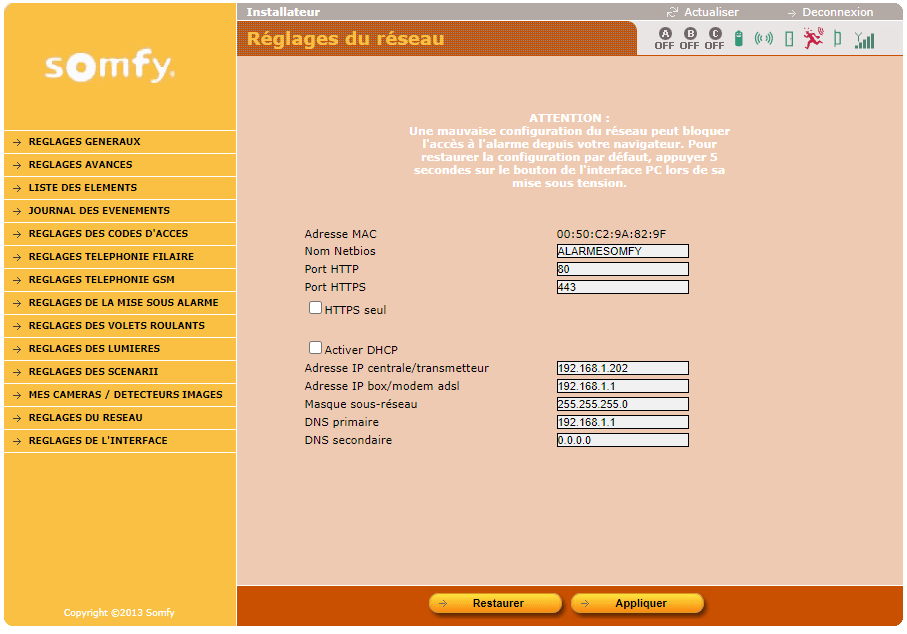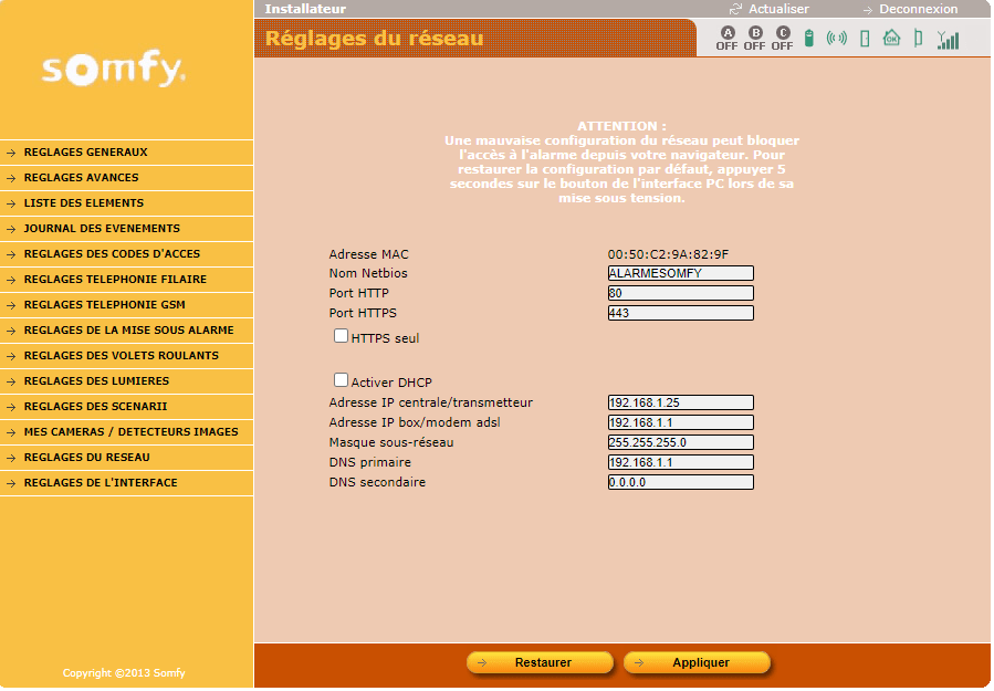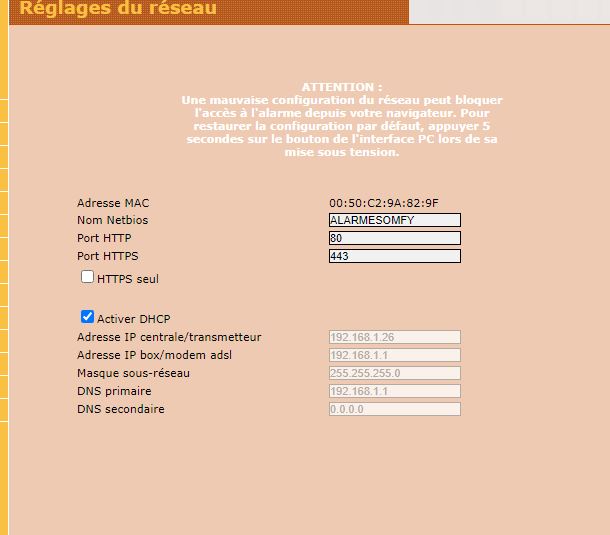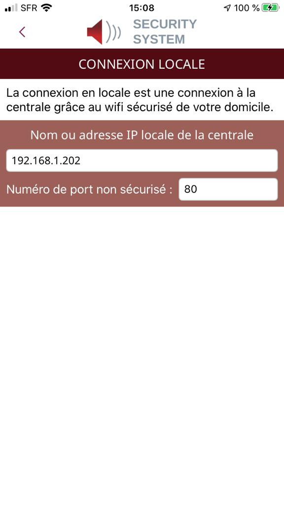 Pour information, l'adresse IP de la centrale trouvée sur la box dans les éléments connectes est 192.168.26