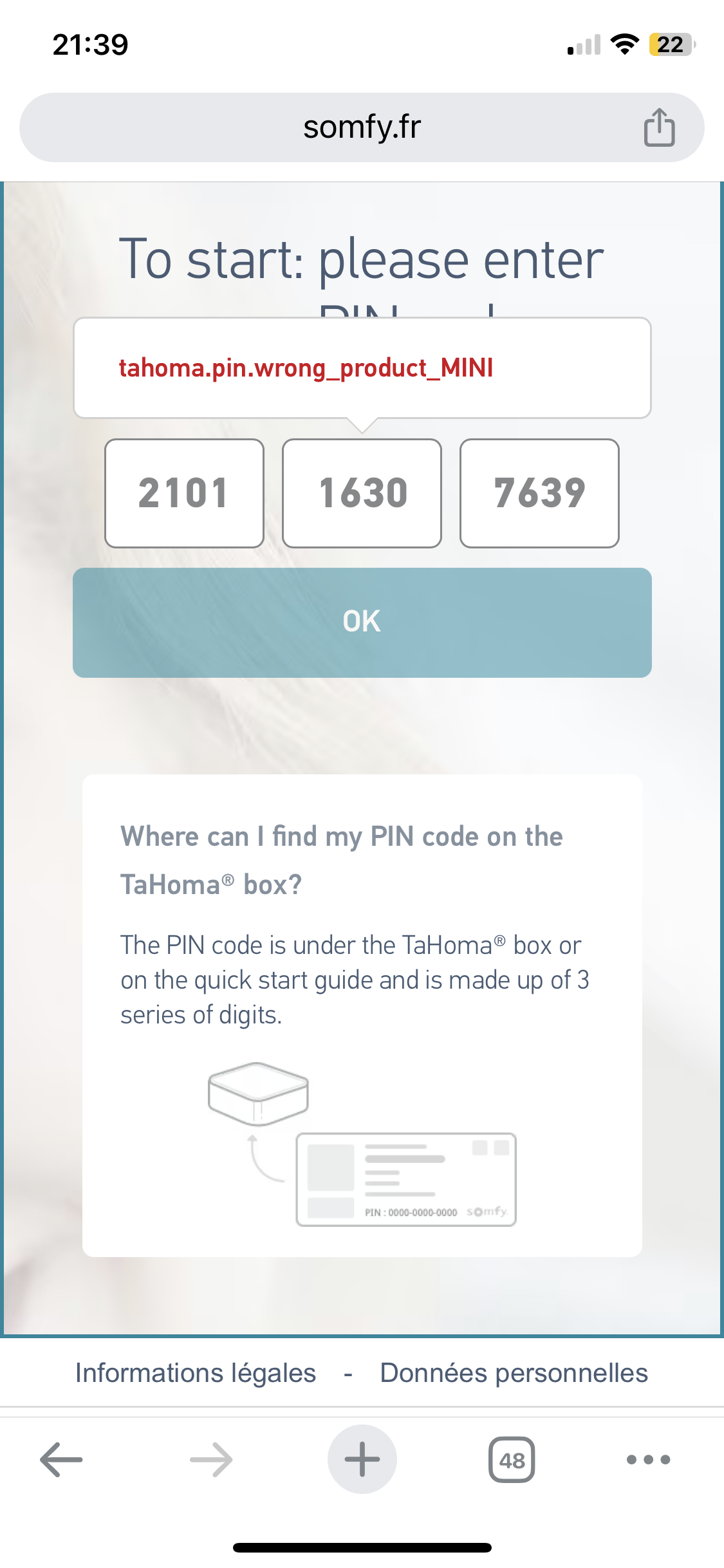 I have bought a Tahoma Switch in Amazon.es (Spain). When I try to activate it with the PIN number shown at the base of the device I get the following message: "tahoma.pin.wrong_product_SWITCH"