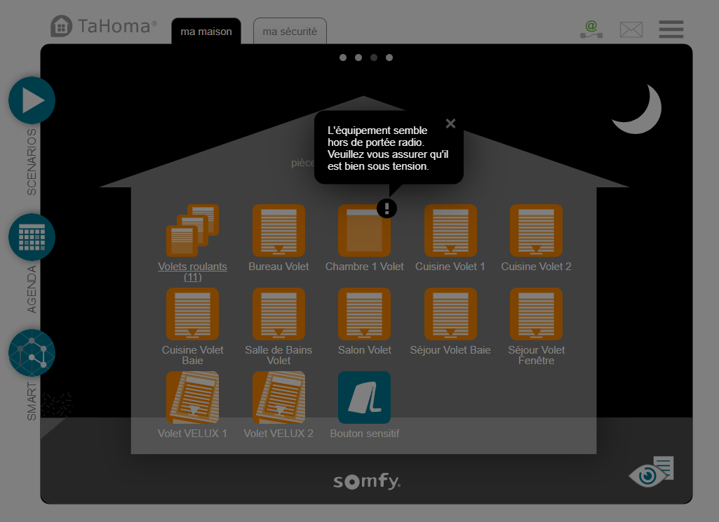 Je suis novice dans le domaine domotique... Nous venons de placer des volets io (type S&SO-RS100 io) commandés par télécommandes smoove io. Je n'ai pas eu de problème pour les appairer à la box Tahoma. Tout fonctionnait bien mais un volet s'est coincé et l'entreprise est intervenue à nouveau. Ils ont dû faire une RAZ du volet. Il fonctionne à nouveau correctement avec la télécommande smoove io mais il ne répond plus à partir de la Tahoma. Il y a un point d'exclamation avec le message: " L'équipement semble hors de protée radio. Veuillez vous assurer qu'il est bien sous tension". J'ai réinitialisé la box Tahoma, je l'ai déplacée un peu mais sans succès... Ce volet était correctement commandé à partir de l'application Tahoma avant et l'emplacement de la box Tahoma est inchangé. Pourriez-vous m'aider s'il vous plaît ? Un grand merci.