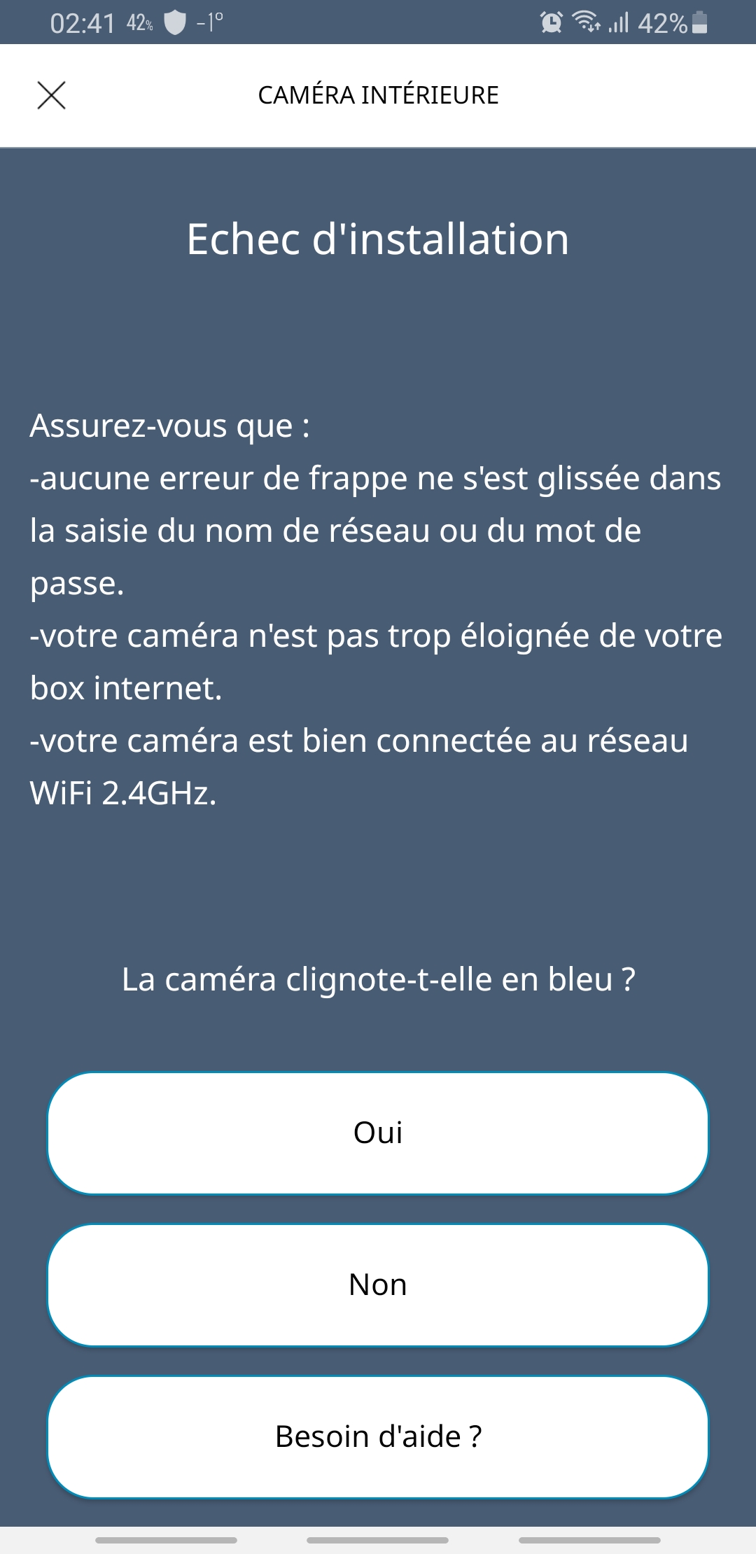 Application réinstallée, MDP changé, caméra x fois réinitialisée et rebranchée, Livebox 5 redémarrée, votre site Web consulté pour voir solutions possibles. Néant.