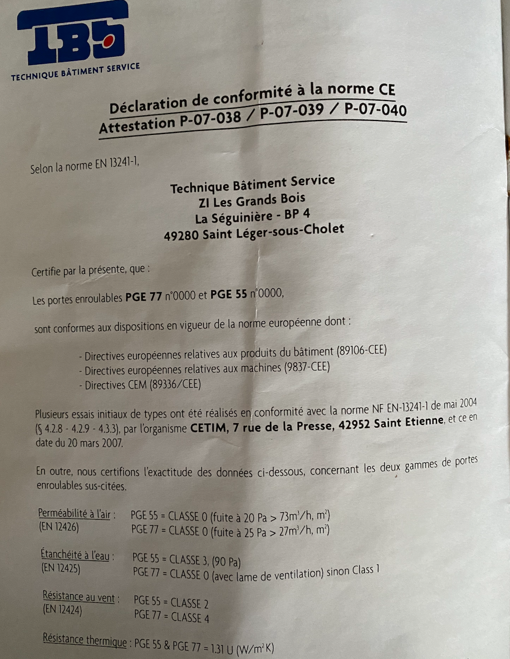 nous avons 2 portes de garage TBS enroulables PGE77 et PGE55.