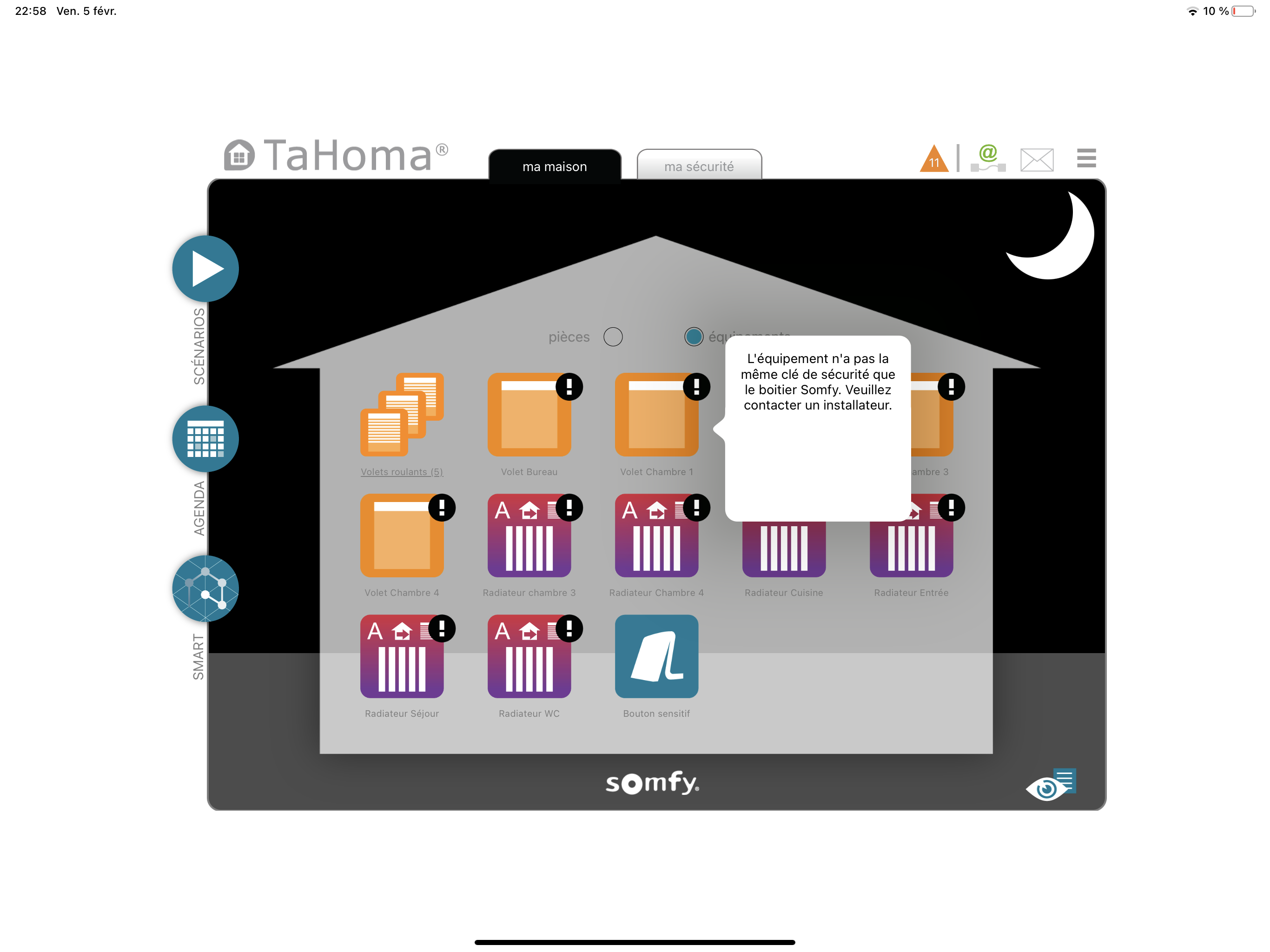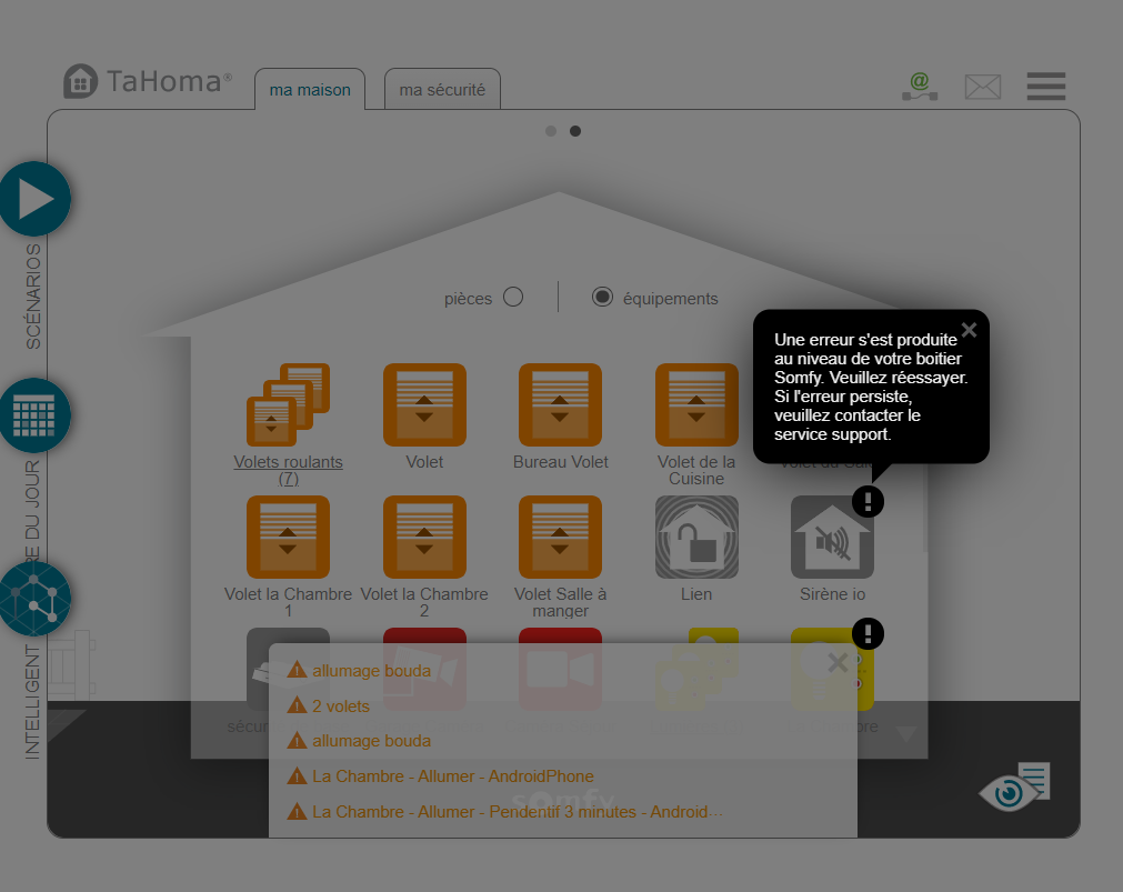 seulement voila après avoir effectuer cette mise à jour les éléments : prises connectées, volets, alarme...ne sont plus actif avec tahoma un point d exclamation s affiche et dit une erreur c est produite au niveau de votre boitier somfy