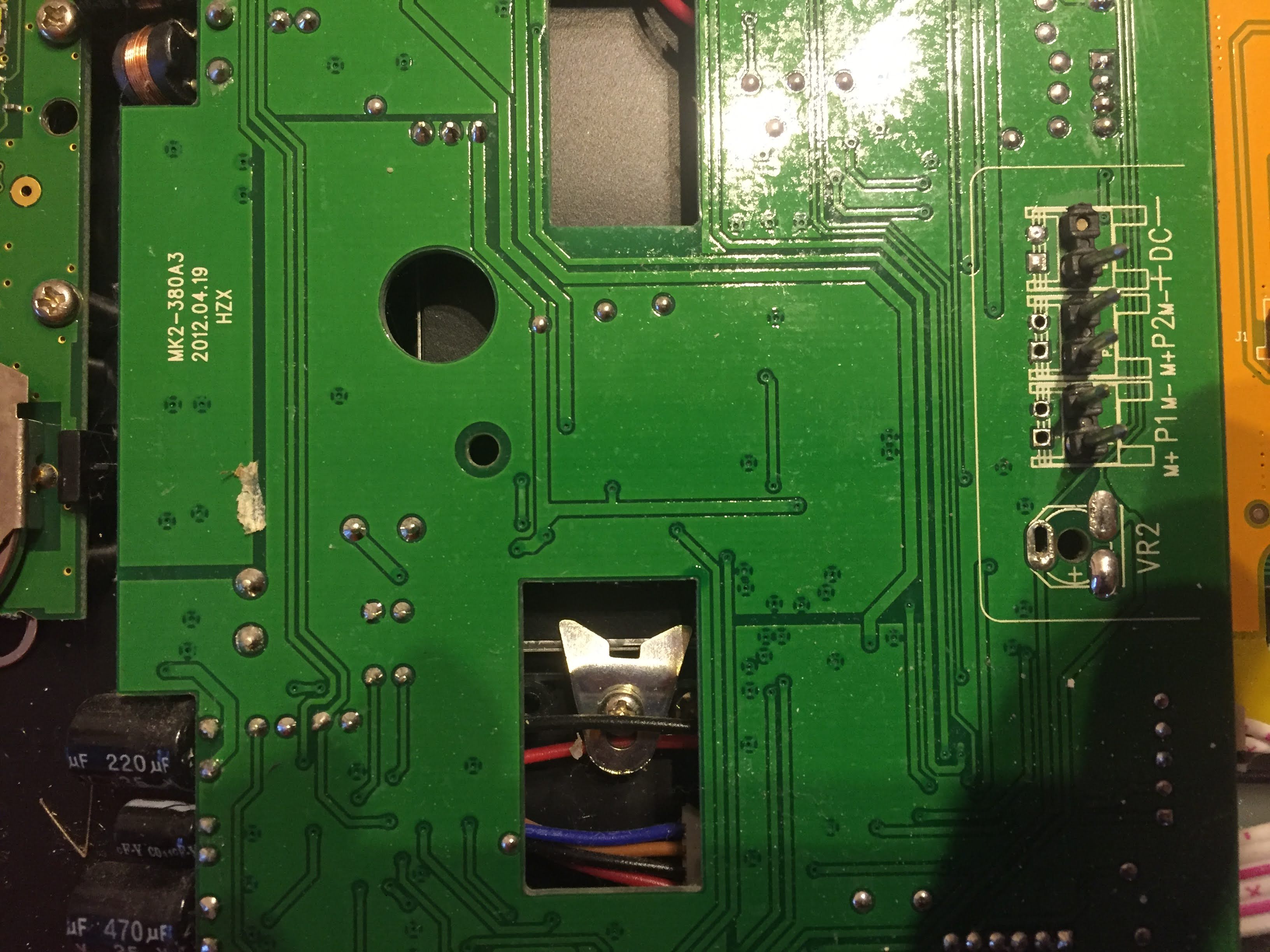 Lorsque j'ai remis en place les boutons P1 et DC, un plot sur les deux du contact DC s'est cassé (voir photo).