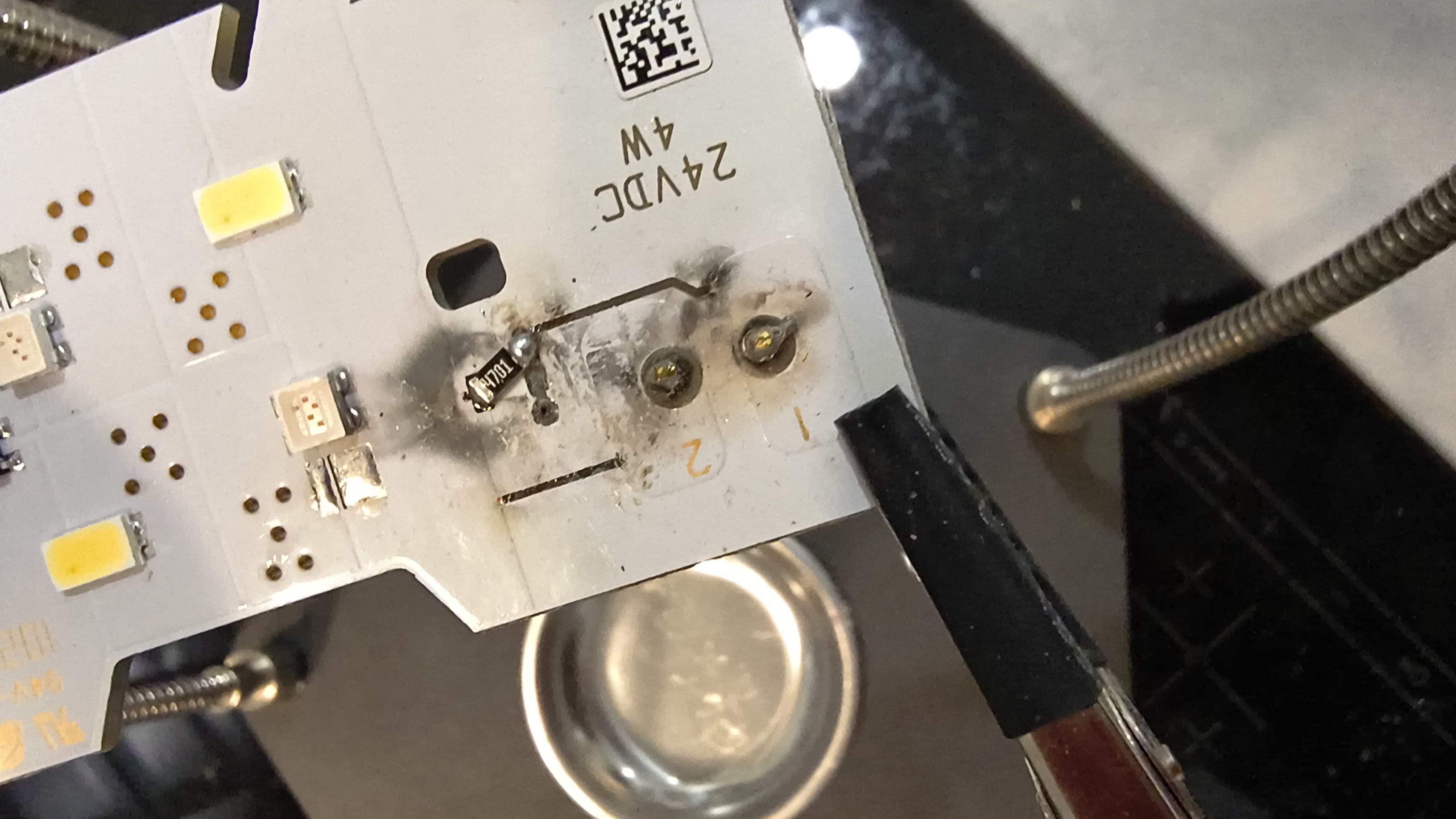 Bonjour. J'ai eu beau nettoyer la piste, la soudure n'adhère pas. Je me demande d'ailleurs s'il y avait encore une piste c'est un peu curieux ça a dû prendre cher avec le 230 volts. Avec la tension de surface pendant la soudure la résistance s'est décalée comme sur la photo. La soudure a pris sur le petit trou à côté. S'agit-il du même branchement ou faut-il que je démonte pour mettre sur le trou de l'autre côté ? Où est-ce que c'est mort si je n'arrive pas à faire adhérer sur la piste d'origine ?