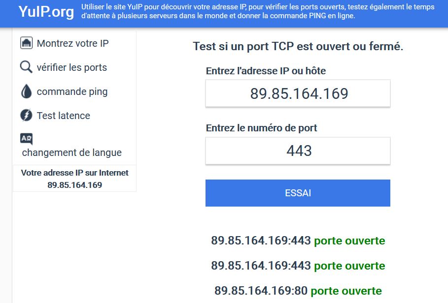 J'ai pourtant bien réinitialisé la carte IP comme suggéré. J'ai ouvert mes ports 80 et 443 avec succès. J'ai changé le port d'accès à distance de la bbox pour 4443 contre 443 comme décrit ci dessus.
