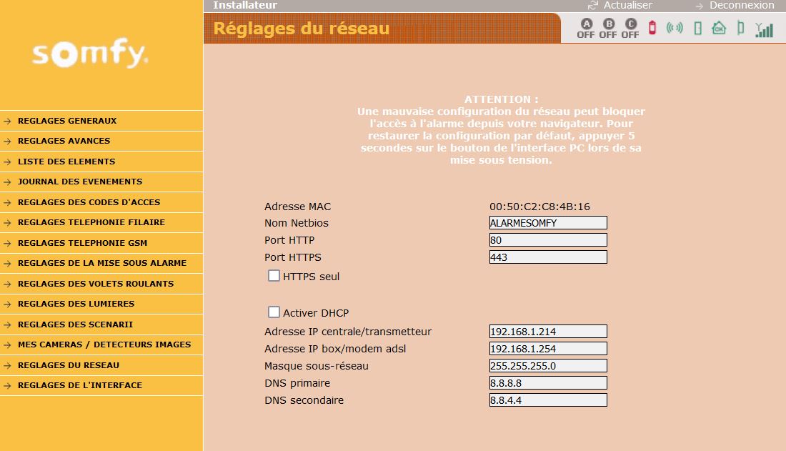 J'ai ouvert les ports 443 et 80 comme stipulé, j'ai également activer le DHCP en attribuant une IP fixe à la centrale via ma box.