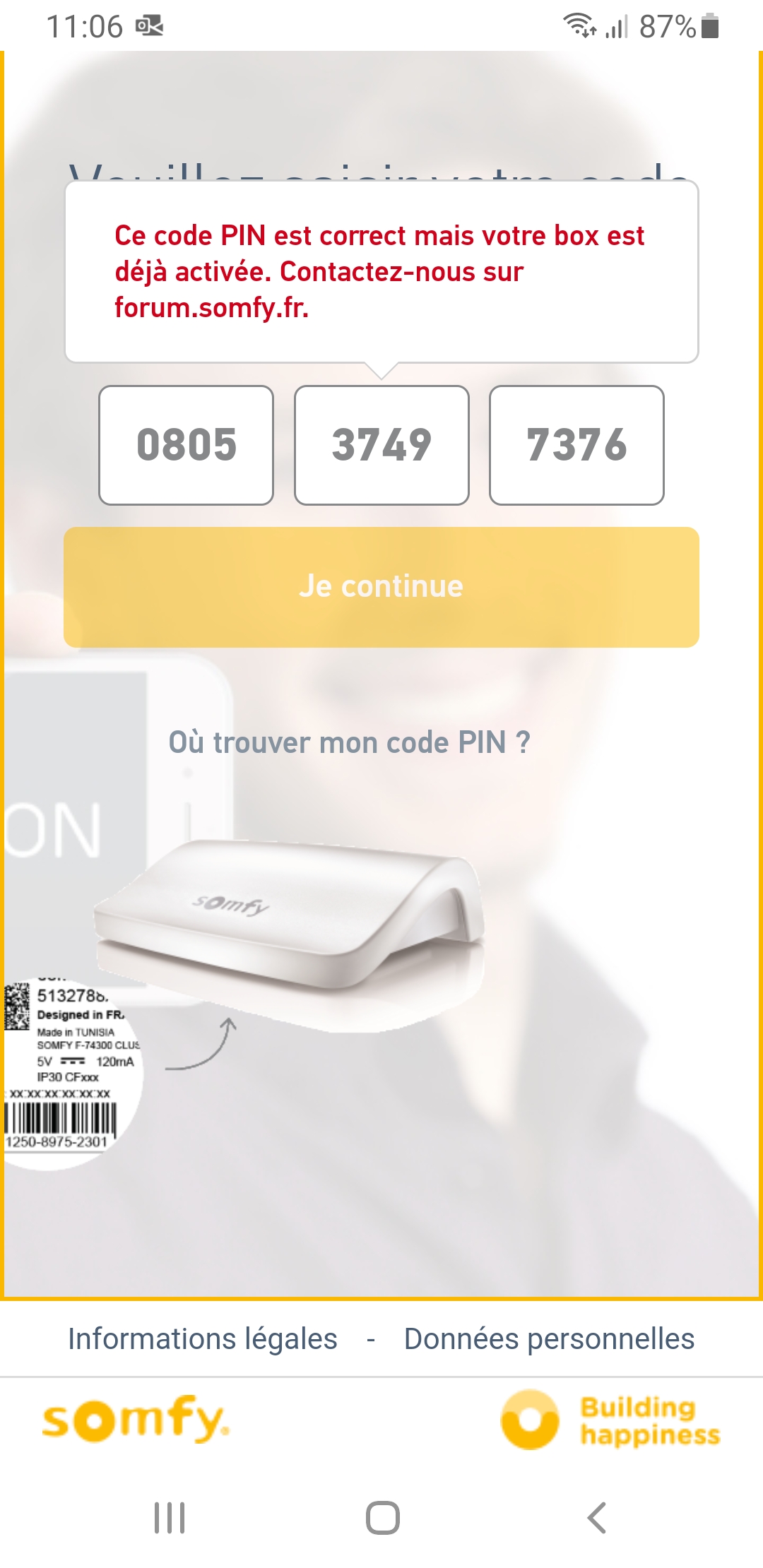 Je viens d'acquérir une maison qui est équipée de volet roulant ,en ayant voulu renseigner mon code le message qui m'a été donné est : "code pin correct mais box déjà activée"