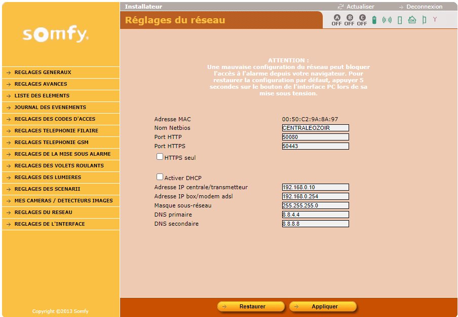 Maintenant il faut modifier ces mêmes ports sur le compte Somfy que vous avez créé avec le N° de la centrale, sinon attendez qu'un Yello effectue la modification.